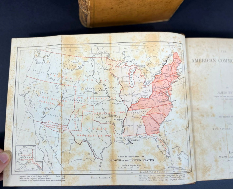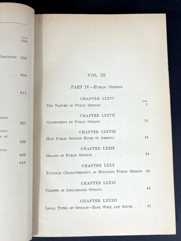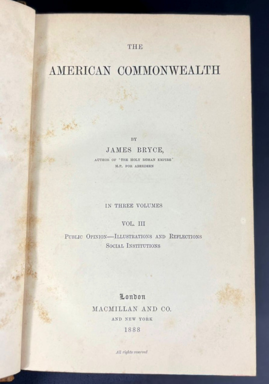 Par James Bryce (1838-1922), juriste, historien et homme politique britannique. Bryce est rapidement devenu célèbre grâce à son livre sur le Commonwealth américain (1888). Le livre examine en détail les institutions des Etats-Unis du point de vue de l'historien et de l'avocat constitutionnel et il est immédiatement devenu un classique.