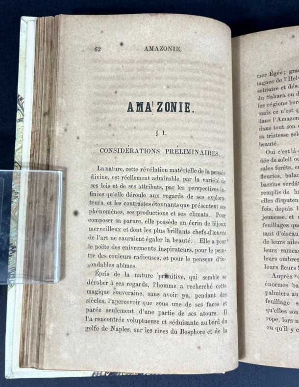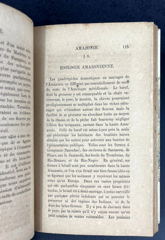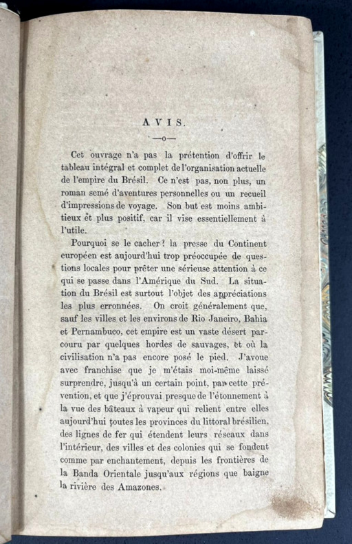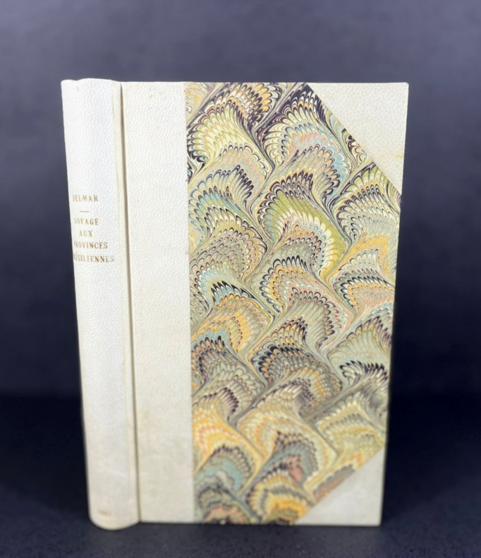 Un volume relié in-12 de 132 x 202 mm, 236 pp. Reliure demi-cuir PU blanc cassé à coins récente, parfaitement dans le style des reliures anciennes. Nom d'auteur et titre en doré, année en doré à la queue, charnières à la Bradel, plats marbrés verts en camaïeu multicolore, tranchefile, couverture originale non conservée. Mention à la plume barrée en haut de la page de titre. Avis de l'auteur en début d'ouvrage. Table des matières et page d'errata à la fin. Nombreuses statistiques en fin d'ouvrage. Le Voyage de Belmar fut publié à une époque où le Brésil n'était pas "à la mode" et peinait à attirer attention, capitaux et travailleurs, comme ce sera le cas dans les années 1890 et 1900. Un témoignage de grand intérêt sur l'Empire brésilien, enrichi de nombreuses statistiques.