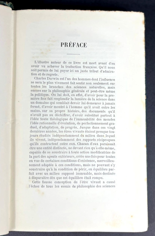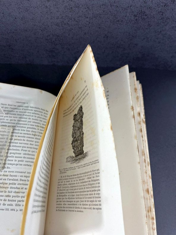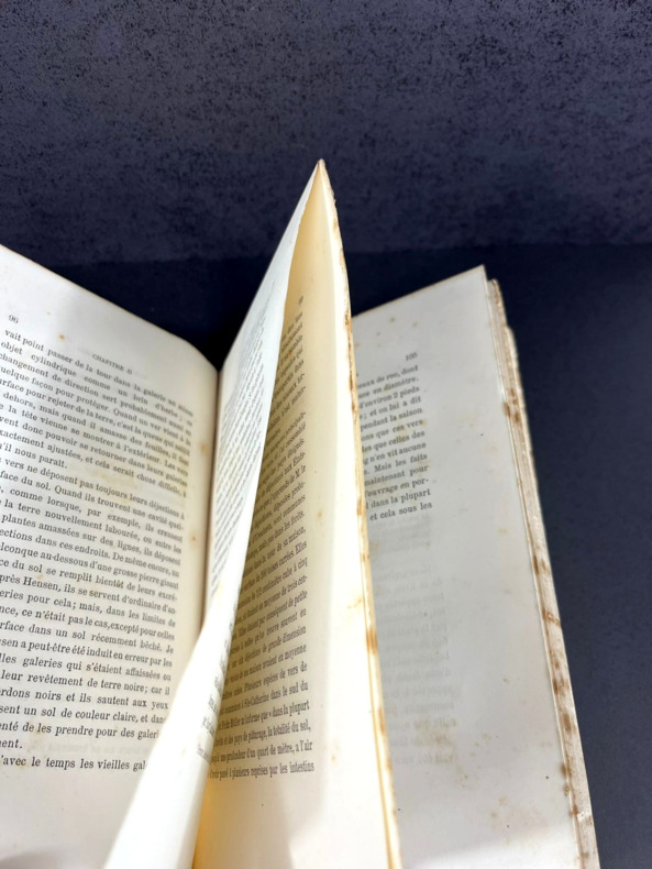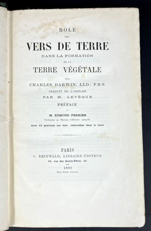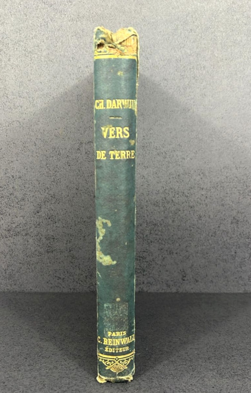 Paris, Reinwald, 1882. Édition originale de la traduction en français du livre "The Formation of Vegetable Mould through the Action of Worms, with Observations on their Habits" de 1881, par M. Levêque. Un vol. in-8 de 235 x 150 mm pour (xxviii) 264 pp. + 20 pp. de catalogue de la librairie Reinwald. Relié pleine percaline éditeur vert bouteille, filets aux plats, nom d'auteur, titre, éditeur en caractères dorés sur le dos, coiffe et queue ornées en doré. Étiquette de la librairie Garraux, première librairie française de São Paulo, Brésil, au premier contreplat. Signature à la plume de 1894 et petit tampon de librairie sur la page de faux-titre, mention au crayon face à la page de titre, table des matières en début d'ouvrage, préface du professeur d'histoire naturelle Edmond Perrier. Avec 15 figures. Partie externe frottée, manque en coiffe, manques au niveau des charnières, coins frottés. Quelques rousseurs, propreté variable, entièrement lisible. Exemplaire non coupé à partir de la p. 44.