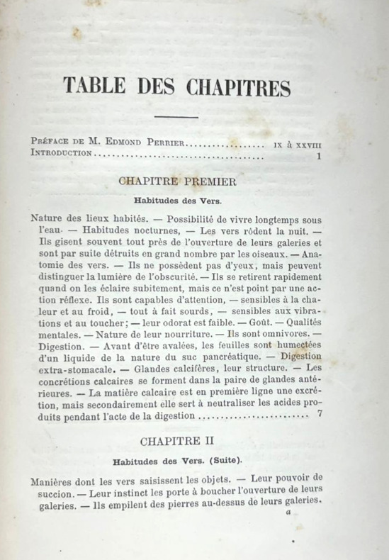 Cette étude est la dernière publiée par Darwin de son vivant. Il y étudie la manière dont les vers de terre et d'autres animaux creusant les sols sont responsables de la formation et du fonctionnement des sols, ainsi que de leur fertilité. Une recherche avant-gardiste. Livre peu courant en français.