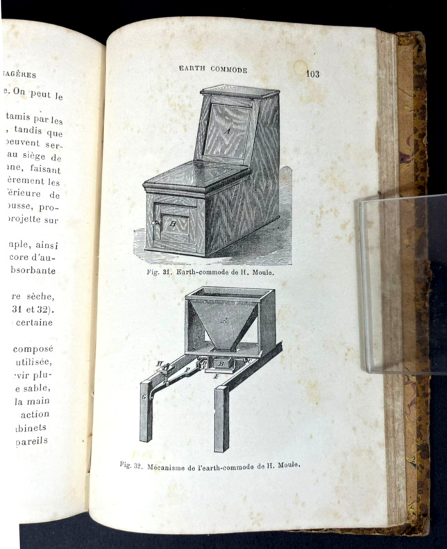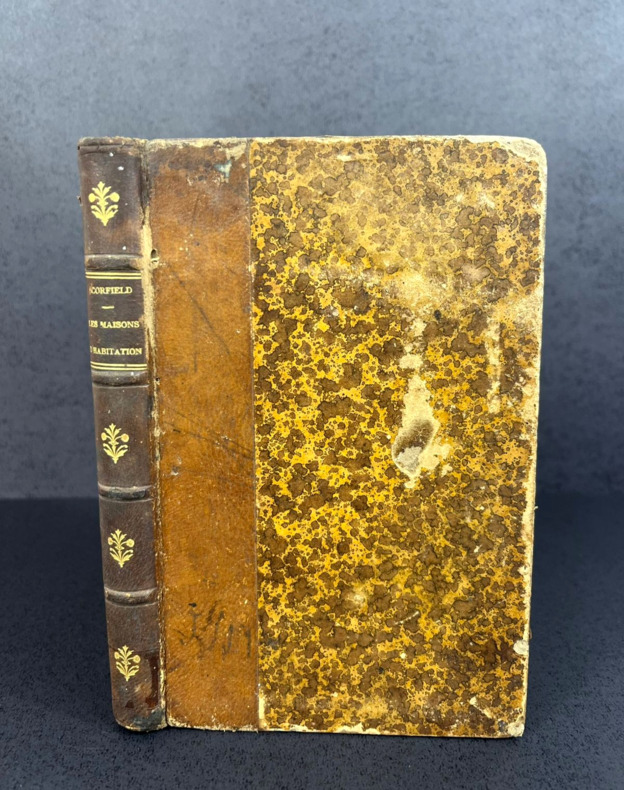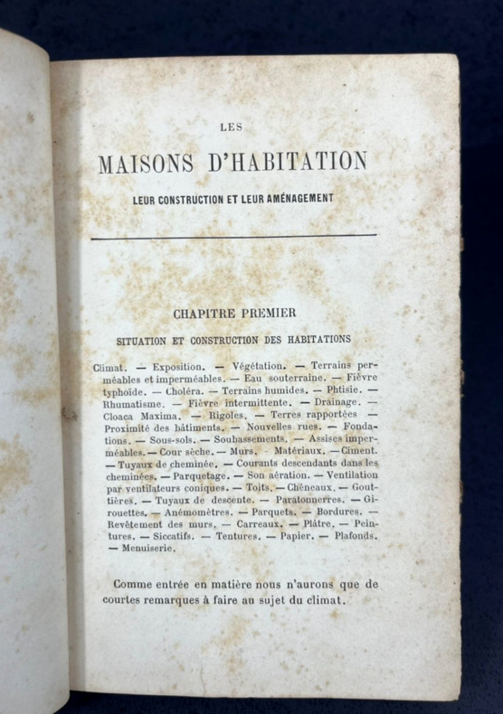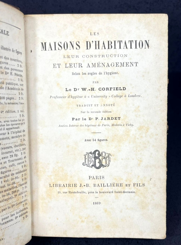 Paris, J.-B. Baillière et fils, 1889. Seule et unique édition de cette traduction en français, d'après la seconde édition revue et corrigée de "Dwelling Houses: their Sanitary Construction and Arrangements". Traduit par le Dr P. Jardet, ancien interne aux Hôpitaux de Paris. Un fin volume in-12 de 125 x 190 mm pour 160 mm. Relié demi-cuir caramel glacé. Dos à 4 nerfs, 4 fleurons dorés, nom d'auteur et titre en doré avec traits et doubles filets dorés. Plats de couverture assortis, gardes colorées marbrées. Marque de la librairie française Mazeron de Porto Alegre, sud du Brésil. Ex dono à la plume de 1896 sur la page de titre. Illustré de 54 figures au fil du texte. Table des matières et index alphabétique en fin d'ouvrage. "Ce livre, qui avait fait l'objet d'un cours, donne sous une forme abrégée les moyens d'aménager une habitation d'une manière saine et confortable. Il étudie la maison au point de vue de sa situation et construction ; il indique les meilleurs procédés de ventilation, d'éclairage et de chauffage ; il traite de l'approvisionnement d'eau, de l'enlèvement des ordures ménagères et des eaux vannes ; les égouts, les water-closets, les éviers et les bains ont été aussi l'objet de développements en rapport avec leur importance... Il s'adresse à nous tous, qui devons nous préserver des dangers qui nous entourent." 6 chapitres : Situation et construction des habitations ; Ventilation, éclairage, chauffage ; Approvisionnement d'eau ; Enlèvement des ordures ménagères et des eaux vannes ; Égouts, égout principal et embranchements particuliers, cheneaux, ventilation, etc. ; Water-closets, éviers et bains, disposition des tuyaux, soupapes, intercepteurs, etc.