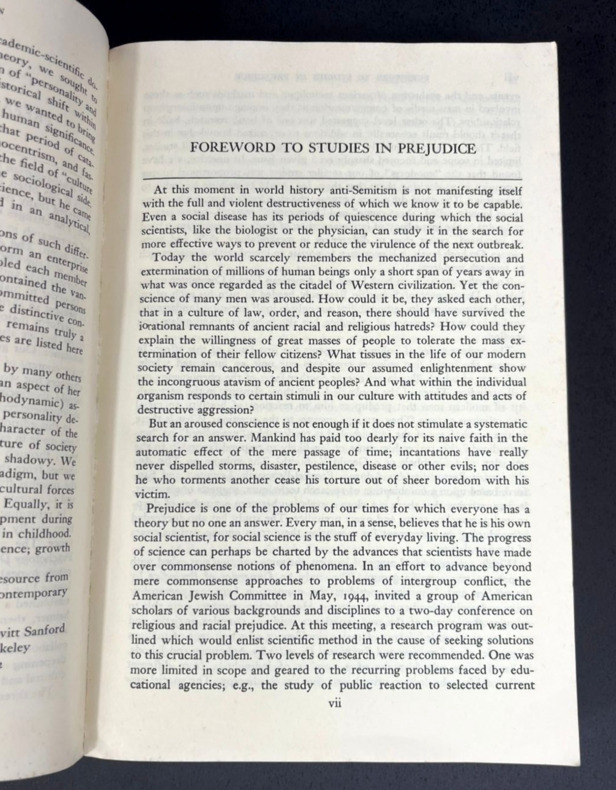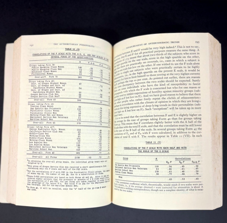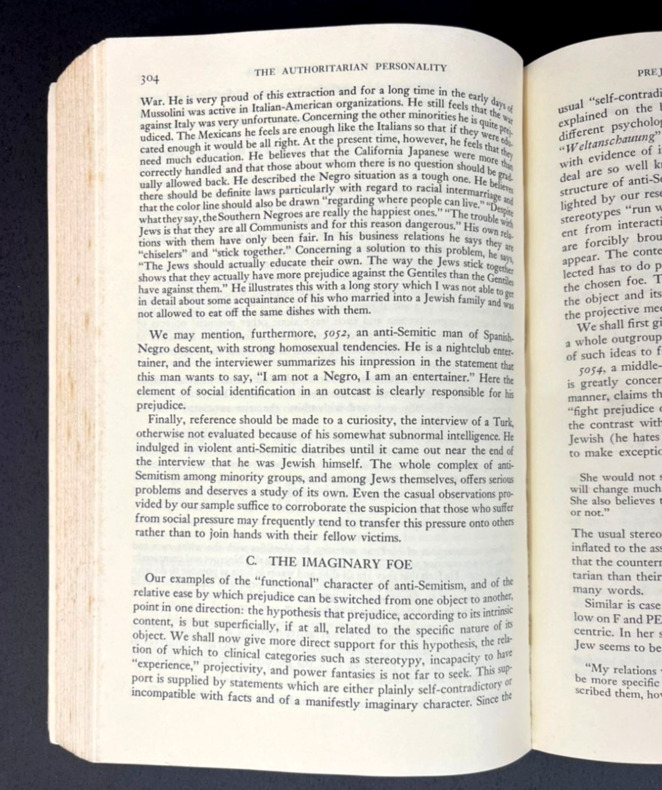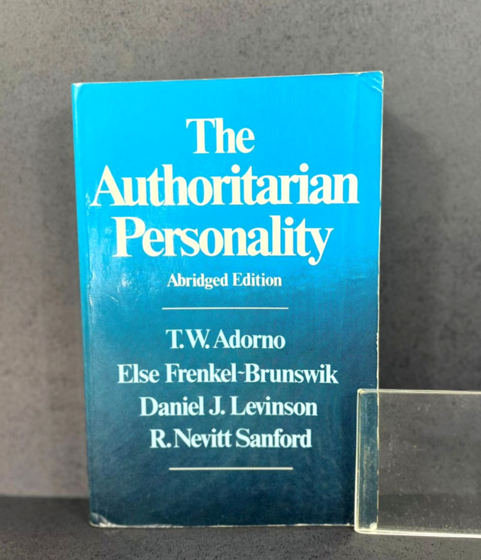 New York, Norton, 1982 [1950]. Abridged edition of Adorno et al.'s landmark study. A duodecimo softcover book of 130 x 195 mm; (xxv) 493 pp. + 3 pp. of catalog. With a foreword for the Abridged Edition, a foreword by editor Max Horkheimer, numerous tables and figures throughout. Index at the end of the book. "Since its first publication in 1951, when it was hailed as a monumental study which blazes new trails in the investigation of prejudice, this book has remained an essential document for the modern world. Written after the single most evil and deliberate act of the century, it undertook the challenging task of determining scientifically what personality traits characterized the phenomenom of authoritarianism and what internal and external forces allowed for its development." Front cover gapes a little, some rubbing on the front cover and tail, a blue pencil mention at the bottom of the half-title page, paper slightly yellowed.