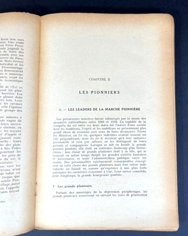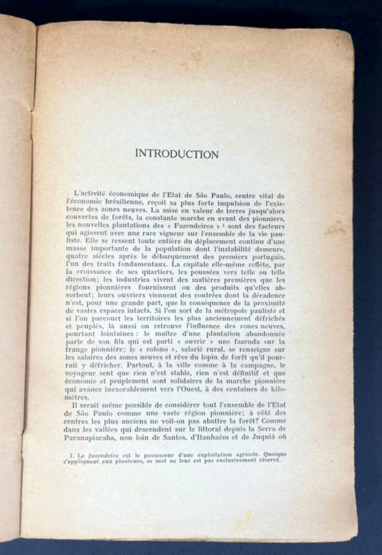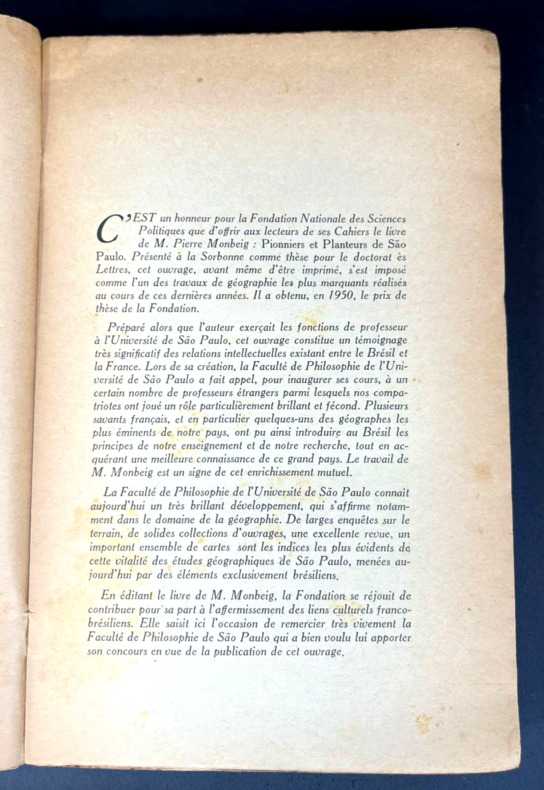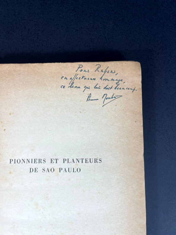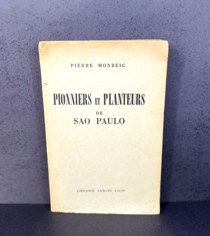 Paris, Armand Colin, 1952. Seule édition. Avec 15 planches hors texte et 45 figures. Co-édité par la Fondation Nationale des Sciences politiques. In-8 broché, 16 x 24 cm, 376 pp. Envoi signé : "Pour Rubens [Borba de Moraes], en affectueux hommage, ce livre qui lui doit beaucoup. Pierre Monbeig" à la pointe-feutre sur la page de faux-titre. Sommaire et glossaire en fin d'ouvrage. Considéré comme un livre de référence dès sa pré-parution sous forme de thèse de doctorat, Pionniers et planteurs de São Paulo refait l'histoire des vagues pionnières d'une région qui était encore un bourg fin XIXe mais connaissait déjà une croissance vertigineuse quand l'auteur écrivait : précurseurs de la culture du café, pionniers de la Belle Époque et de 1929, défrichement, pâturages, villes nouvelles... Monbeig participera plus tard à la création de l'USP, université fédérale la plus réputée du Brésil, avec Claude Lévy-Strauss et Roger Bastide.