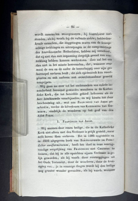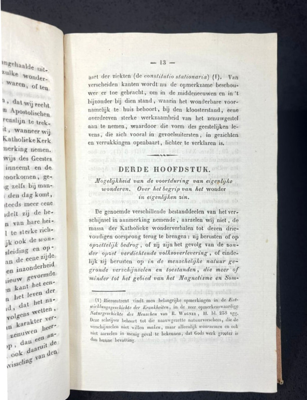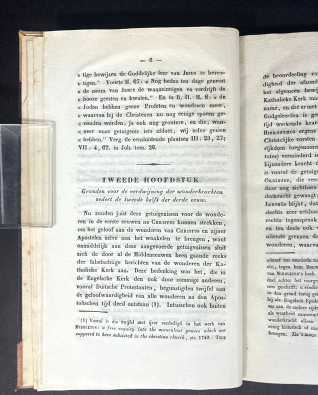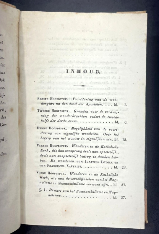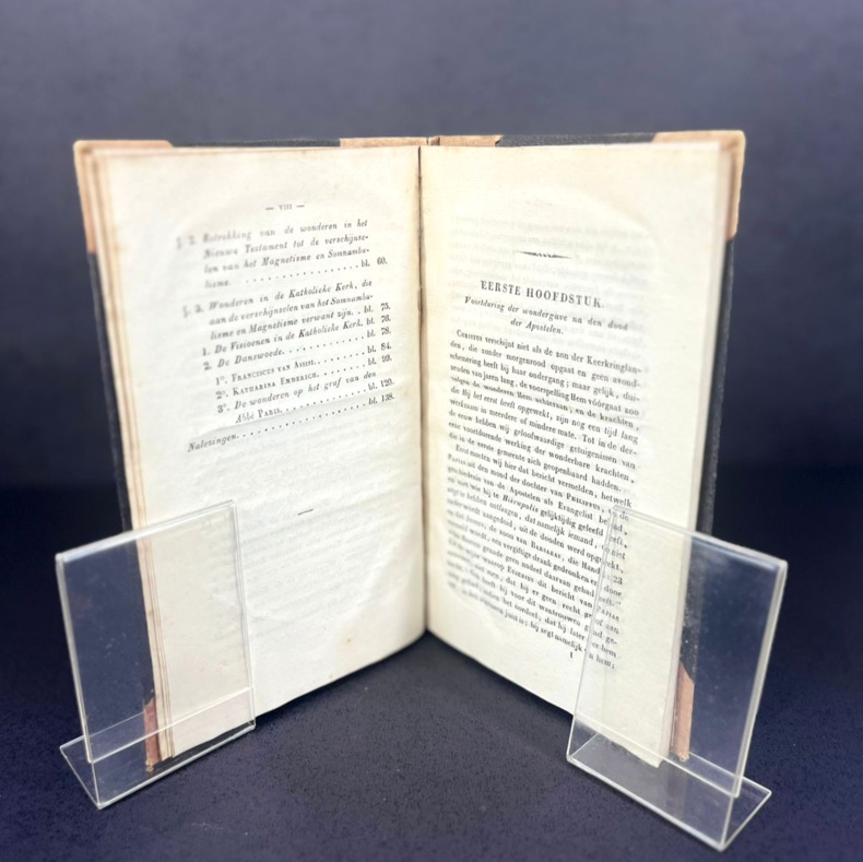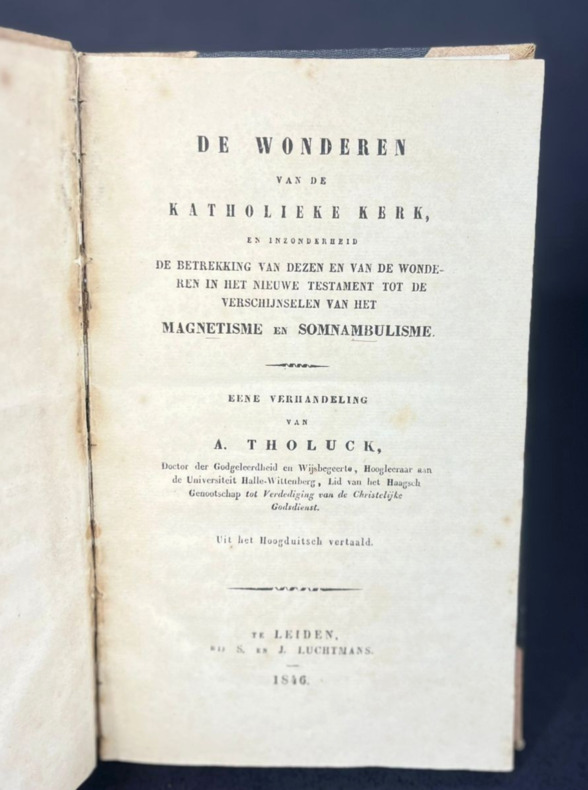 Leiden, J. Luchtmans, 1846. First and only edition. In Dutch. A booklet of 13 x 21 cm, (viii) 142 pp. Hardbound, half-discolored red cloth with corners and half black cloth. No mention on the spine. Half-title and title pages, Voorbericht (Foreword), Inhoud (Table of contents), 5 chapters. A few pencil markings on the flat end plate, including the mention of antiquariat Theo de Boer. This book tries to explain miracles by the Apostles, Francis of Assisi, Katharina Emmerich, Abbé Paris and other Catholics as cases of visions, "magnetism" and "somnambulism." Pages are very clean and toned. A few insect marks on the front and back covers with no damage on the pages. Spine shows some aging. Binding slightly loose from the book, the page block being solid.