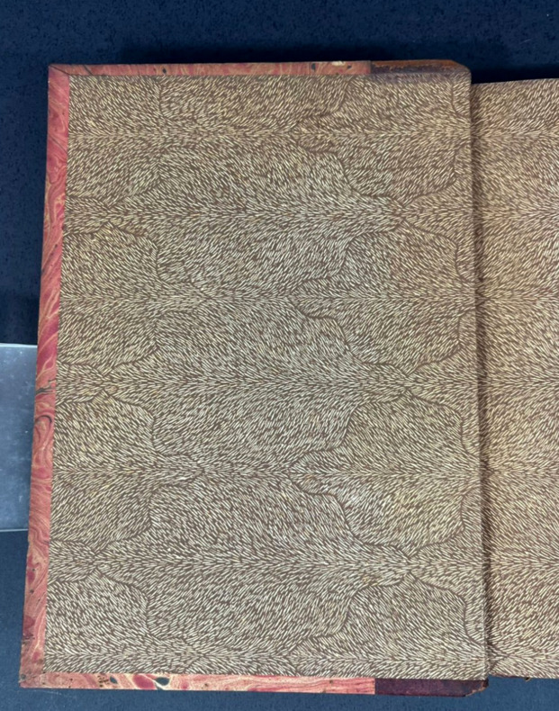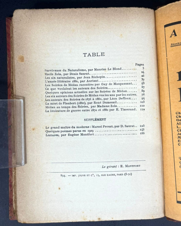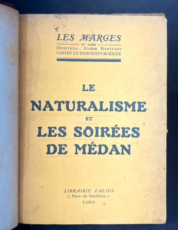 Paris, Librairie Valois, 1930. Cahier de la 27e année de la publication "Les marges". Commémoration du cinquantenaire des "Soirées de Médan." Un volume in-12 de 14,5 x 20 cm pour 159 pp. Relié demi-cuir à 4 nerfs. Dos frotté; nom de la revue, titre, deux traits et un fleuron à motif floral en doré bien visibles. Plats marbrés assortis, gardes colorées taupe, tranchefile. Couverture conservée. Légers surlignements au crayon à la couverture. Contient notamment : Survivance du naturalisme (Maurice Le Blond), Emile Zola (Denis Saurat), Les six naturalismes (Jean Richepin), L'année littéraire 1880 (Auriant), Les Soirées de Médan racontée par Guy de Maupassant, Ce que voulaient les auteurs de Soirées, Quelques opinions actuelles sur les Soirées de Médan, le Six auteurs des Soirées de Médan vus les uns par les autres, les auteurs de Soirées de Médan de 1876 à 1880 (Léon Deffoux), La mort de Flaubert 1880 (René Dumesnil), Médan au temps des Soirées (Madame Zola), La littérature de guerre entre 1870 et 1880 (E. Tisserand), Le grand maître du moderne : Marcel Proust (D. Saurai), Quelques poèmes parus en 1929, Lectures (E. Montfort).