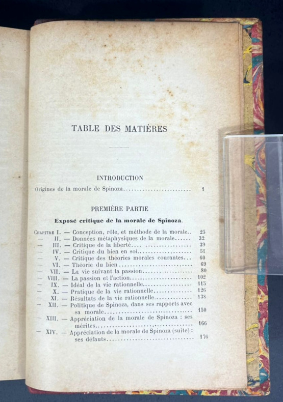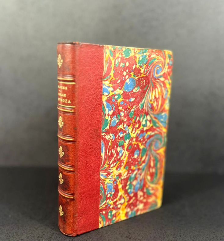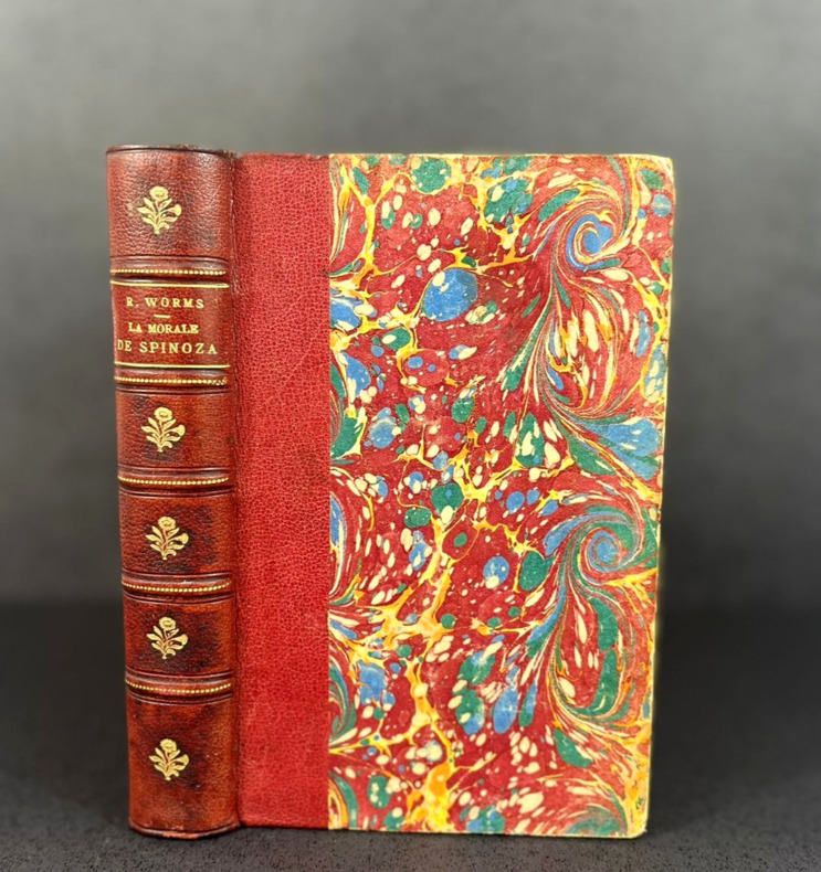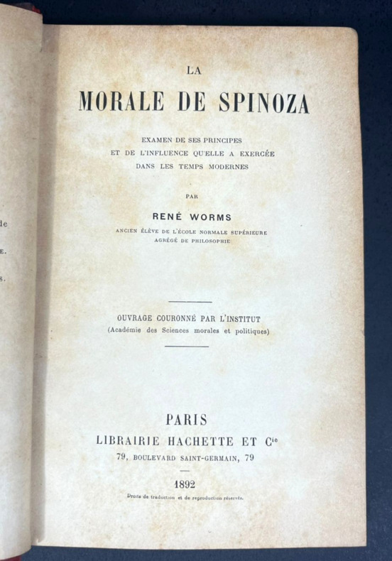 Paris, Hachette, 1892. Unique édition. Livre relié in-12 de 12,5 x 18 cm pour 334 pp. Relié demi-chagrin amarante, dos à 5 faux-nerfs soulignés en pointillés dorés, nom d'auteur et titre frappés en caractères d'imprimerie dorés, 5 fleurons floraux dorés, papiers colorés de couverture en polychromie, gardes marbrées. Table des matières en fin d'ouvrage. Le livre procède en deux parties : un "Examen critique de la morale de Spinoza" et une "Histoire de l'influence exercée par la morale de Spinoza". Un joli témoignage d'une époque où les livres de philosophie étaient suffisamment valorisés pour être mis sous de belles reliures.