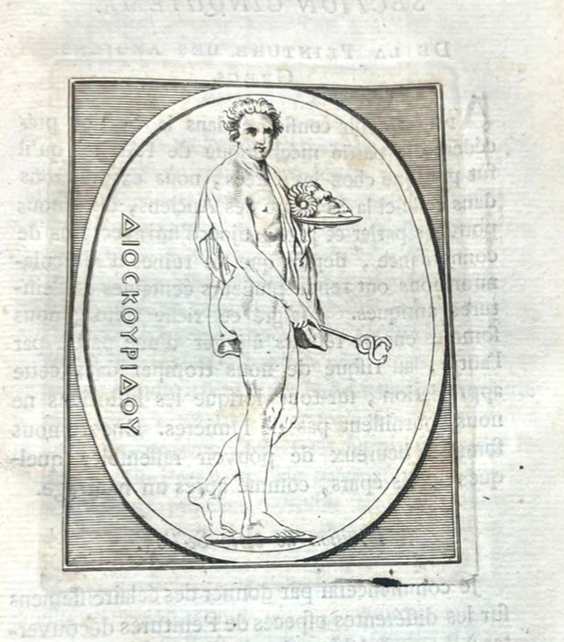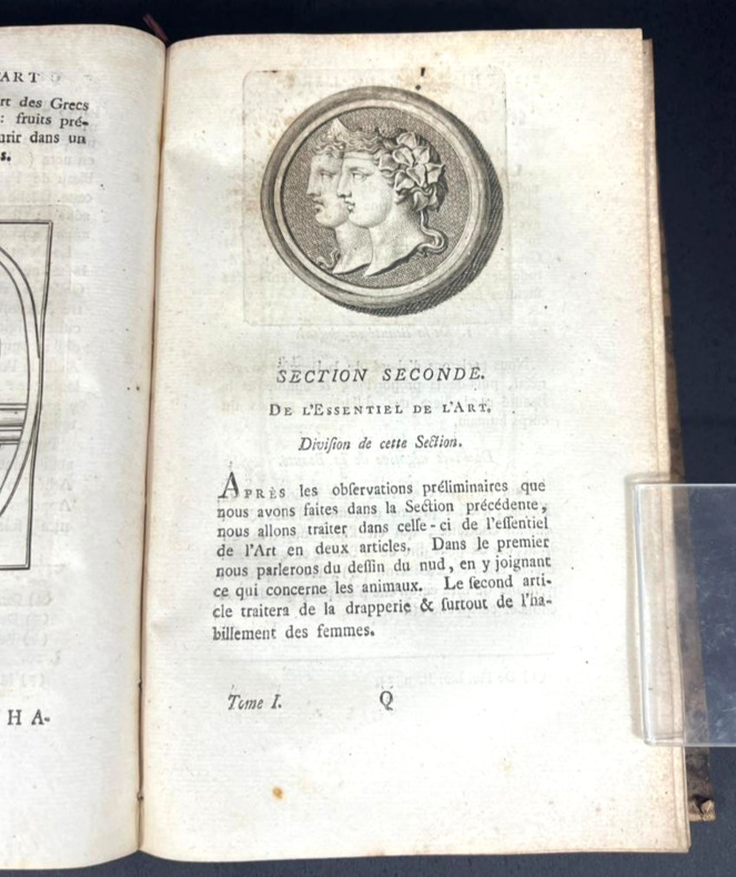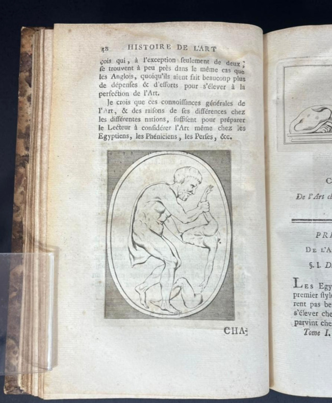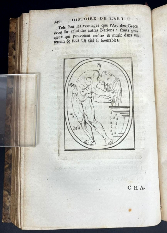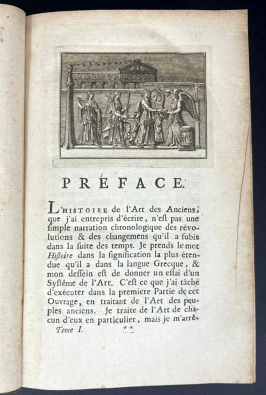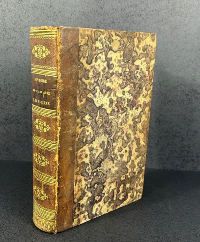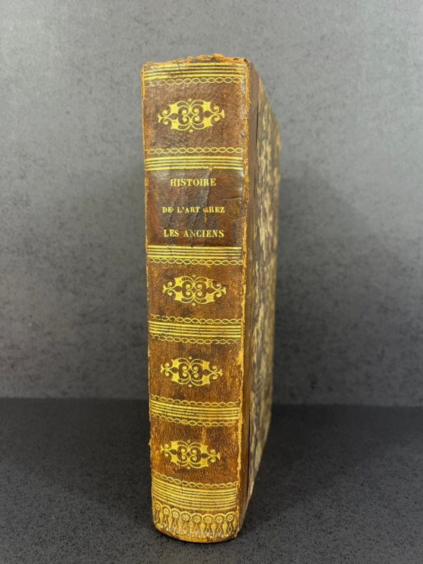 Paris, 1790 –1803 ; 2 tomes reliés en trois volumes in-4°, demi-veau brun glacé, dos lisse orné de jeux de quadruples fillets dorés et filets à froid, petites palettes dorées en tête et pied, auteur, titre et tomaison dorés . Illustré de vignettes dans le texte et hors texte de 3 frontispices et 65 planches.Tome 1 , Paris Barrois, 1790 ; CIIpp, 695pp.,1p.nch. ; frontispice ( portrait de Winkelmann d’après Salésa) et 25 planches hors texte )Tome 2 : Paris, Jansen et Comp., An IIe ( 1794) ; 2ff.nch.,692pp. ; frontispice et 37 planches hors texte.Tome 3: Paris, Bossange , Masson et Besson, XI, 1803 ; 3ff.nch.,405pp ; frontispice et 3 planches hors texte.
