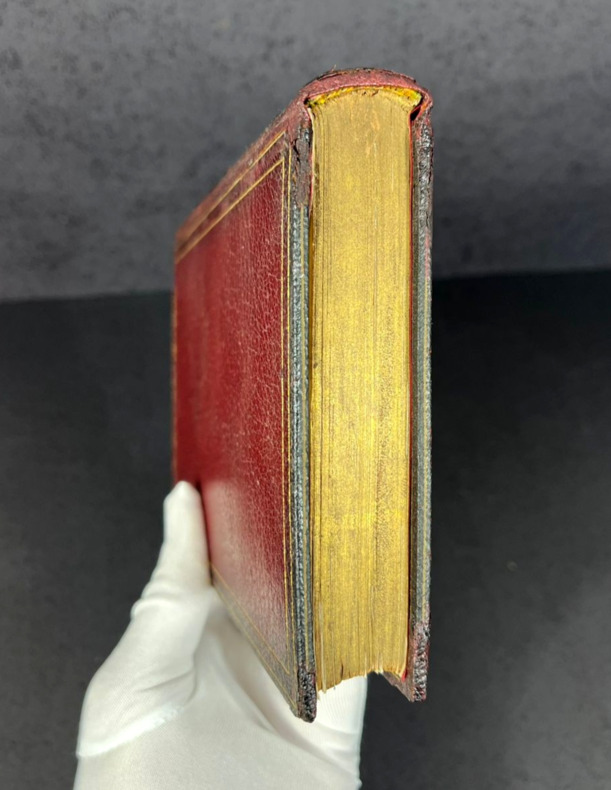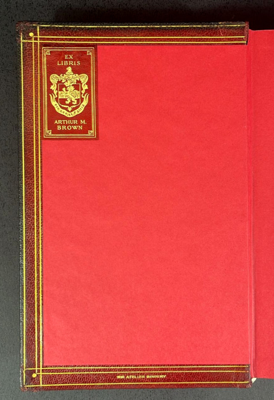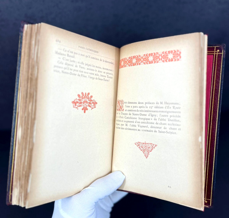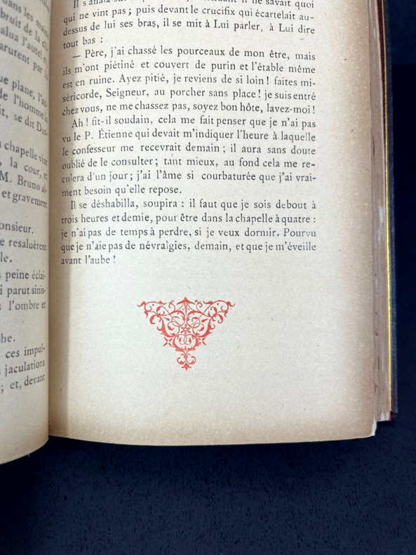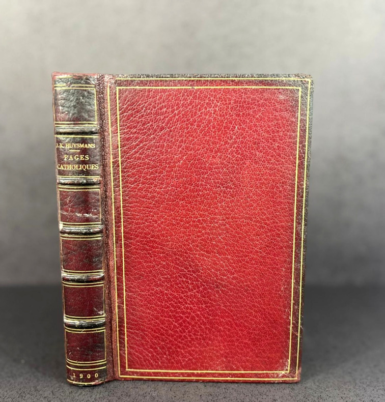 Paris, P.-V. Stock, 1900. Édition originale dédicacée. In-12, 130 x 185 mm, 442 pp. Relié plein maroquin rouge amarante, dos à 5 nerfs, nom d'auteur et titre en doré, caissons à doubles filets horizontaux aux entrenerfs, date en queue, plats à double encadrement doré. Triple encadrement aux contreplats. Reliure signée The Atelier Bindery, relieur américain proche de l'éditeur Charles Scribner, avec ex-libris d'Arthur M. Brown qui fut le probable commanditaire de la reliure. Couverture conservée. Signé à la plume ("Hommage de l'auteur") par Huysmans à la page de faux-titre. À noter que la page de titre indique la date de 1899 et la couverture 1900. Quasi toutes les pages ont été renforcées par le relieur pour prévenir leur friabilité. "Rarement l'homme et l'auteur se sont identifiés davantage que chez M. Huysmans. C'est à peine si le romancier se distingue des types qu'il a créé. Décrire, avec sa précision, les effets de certains sacrements, c'est les avoir ressentis, à deux genoux, comme un croyant. Et il faut être encore pratiquant pour se plaire aux mystiques, pour se nourrir de la liturgie, pour s'approprier la pensée des saints, pour glorifier l'Église avec des accents qui n'appartiennent qu'à ses fils." (Abbé A. Mugnier, Préface) Frises et culs-de-lampe rouges uniques à travers l'ouvrage. Lettrine à chaque début de chapitre.