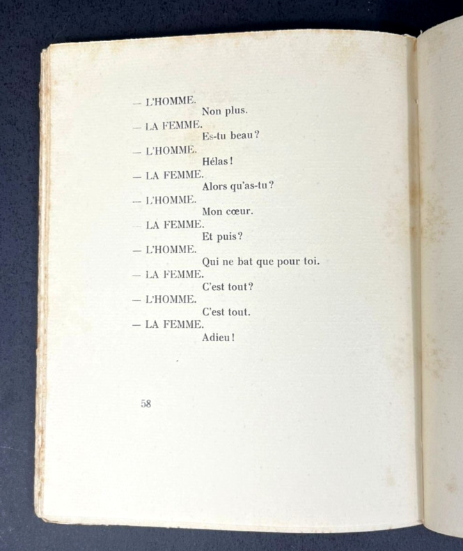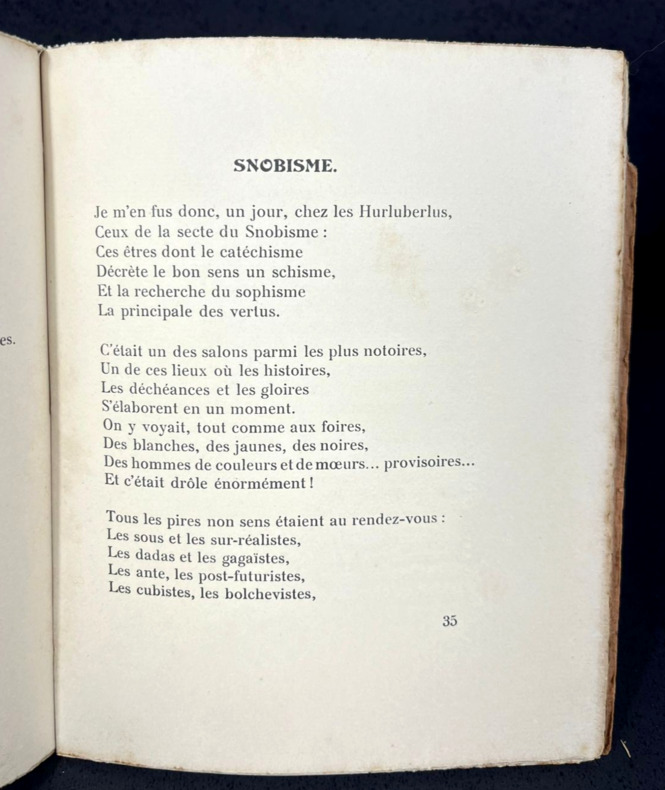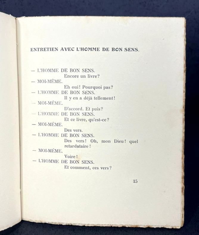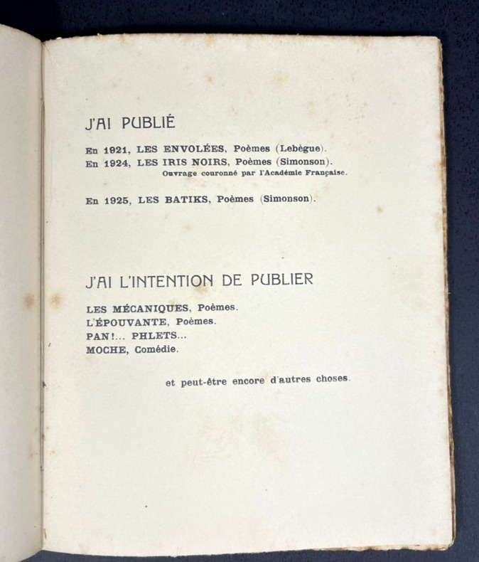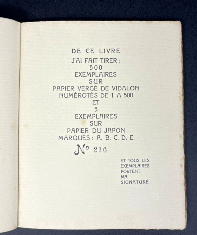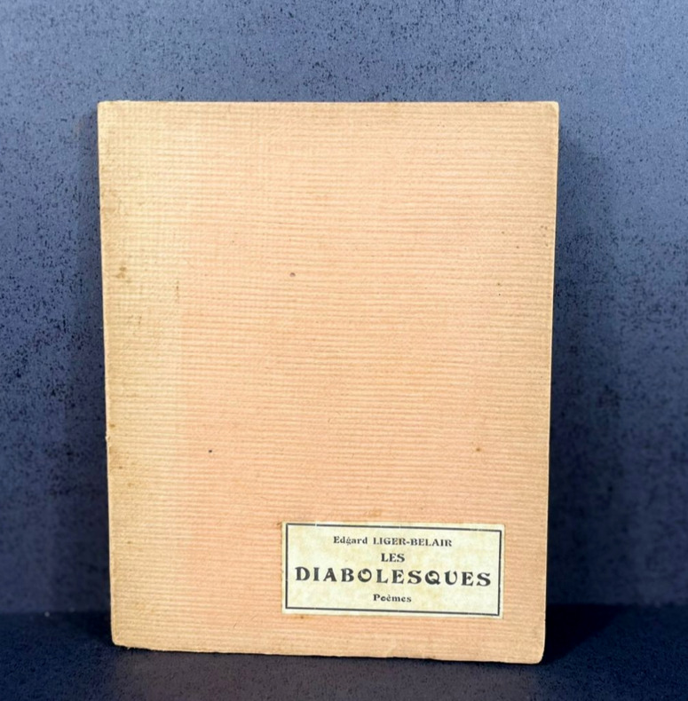 Namur, imprimerie Picard-Kaisin (auto-édité), 1928. L'un des 500 sur vergé de Vidalon, celui-ci le nº 216. Non signé par l'auteur en dépit de la mention "tous les exemplaires portent ma signature". Un volume broché, quasi carré, de 14 x 18 cm pour 61 pp. Couverture en papier cartonné à motif de lignes imbriquées et de petits carrés oranges. Blason en transparence à la garde blanche, mention "Vidalon" en lettres gothiques également visible en transparence à la page de faux-titre. Poèmes : Entretien avec l'Homme de Bon Sens ; La Prière pour le Bienaimé ; Mon Âge ; Illusion ; Chut ! ; Le Rocher ; Les Chimères ; Snobisme ; Afrique ; Requiem ; Noël ! ; Monsieur l'Obèse ; L'Usine Électrique ; La Locomotive ; Divergence. Francophile convaincu, poète et professeur de français, le Brésilien Edgard Liger-Belair a été lauréat de l'Académie française à deux reprises. Son recueil de poèmes Les iris noirs (1925) a reçu le prix Archon-Despérouses et son essai Comment la Fontaine est devenu fabuliste (1953) le prix Émile Faguet. Recueil au ton léger, Les Diabolesques célèbre pêle-mêle la technique conquérante du chemin de fer ou de l'électricité scintillante, le continent africain, tout en faisant preuve d'une ironie cocasse sur les obèses pleins d'esprit, une femme qui ne voit chez un homme qu'une liste de cases à cocher ou l'absurdité de mots dépourvus de sens dans un salon mondain.