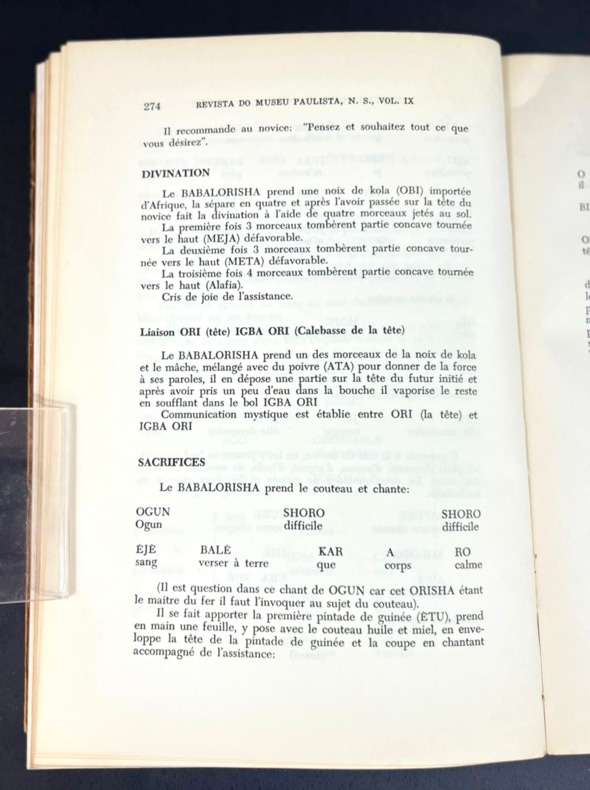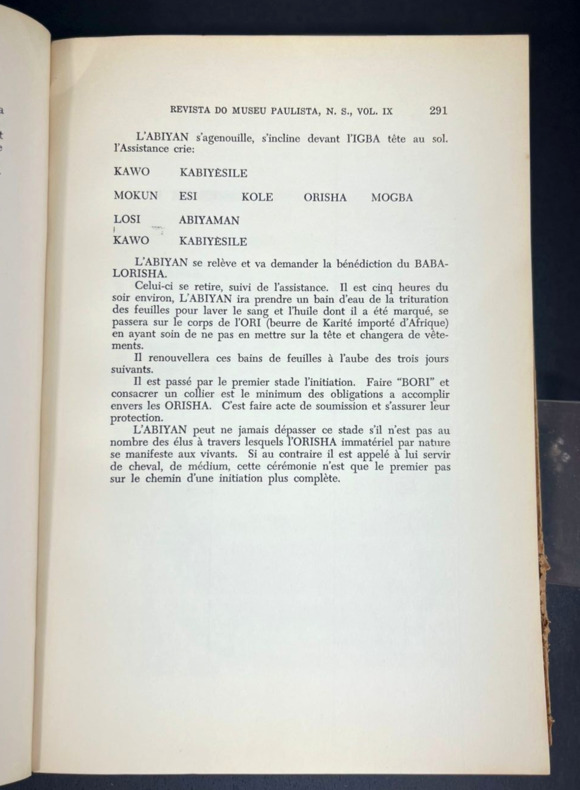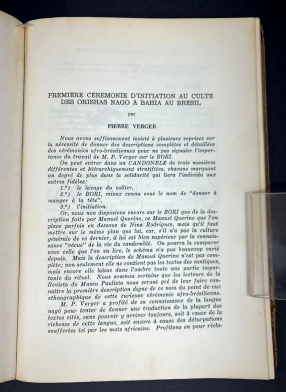 São Paulo, Revista do Museu Paulista, Nova Série: Volume IX, 1955. Édition originale de l'un des articles majeurs de Pierre Verger. Unique article en français dans une publication annuelle en portugais brésilien. Préfacé par Roger Bastide et illustré d'un dessin d'un rite du culte Orixa (orishas) en vue du dessus. L'article s'étend de la pp. 269-291 pour 22 pp. en tout. Roger Bastide fut professeur de sociologie de 1938 à 1954 et l'un des fondateurs de l'Université de São Paulo (USP), aux côtés de Claude Lévi-Strauss. Pierre Verger (1902-1991), dit Fatumbi, fut ethnographe et photographe spécialiste des religions afro-brésiliennes, notamment Babalawó, culte dans lequel il fut initié.