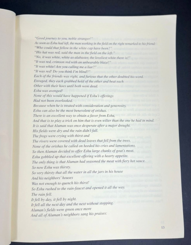 Salvador, Corrupio, 2006. First edition of the English and Spanish translation of Verger's original French and Portuguese book published in 1985. Wide in-8, 19 x 25 cm, 151 pp. Softcover. Green cover. Title in yellow and off-white. Illustrated with drawings by Carybé. Written in Spanish on the left pages and English on the right ones. Chapters: The Birth of Oraniyan; A Hunter becomes Orisha Oko; How Olokun Became Queen of the Waters; The Quarrel Between Oshala and Eshu; The War Between Oshala and Oduduwa; and many others.