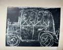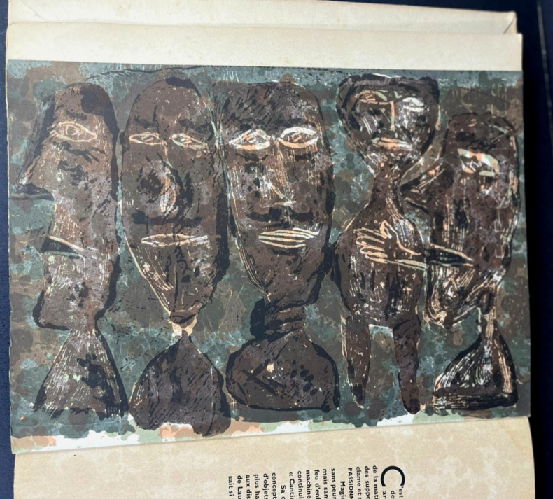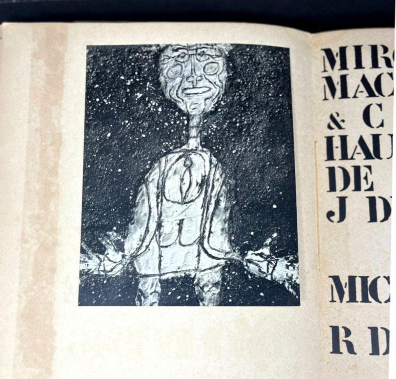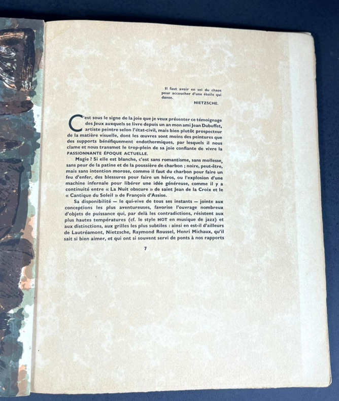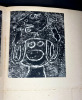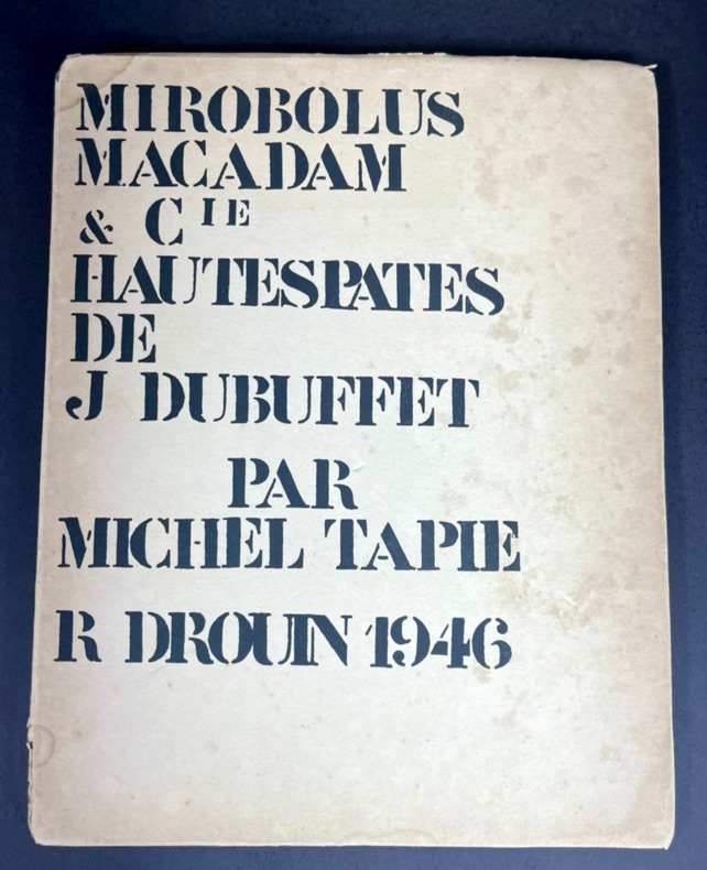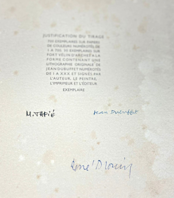 Paris, R. Drouin, 1946. Édition originale. L'un des rarissimes 30 exemplaires sur grand papier, celui-ci non justifié (pourrait-il y en avoir eu plus de 30 ?) mais bien complet de la lithographie en début d'ouvrage et des signatures de l'auteur, de l'artiste et de l'éditeur-galeriste au colophon. Grand volume broché de 25,5 x 35,cm. Couverture rempliée typographiée, dos muet. 56 (ii) pp. Imprimé sur fort vélin d'Arches à la forme comprenant une lithographie originale en couleur de Jean Dubuffet, "Suite de visages bronzés", juste après la page de titre. Garni de 31 reproductions en noir et blanc contrecollées, dont le frontispice. Texte de Michel Tapié. Pages irrégulières, beaucoup plus petites que le format total du livre, ce qui créée un effet de volumes et de lignes successives d'une page à l'autre. Signatures de Michel Tapié, Jean Dubuffet et René Drouin en fin d'ouvrage, chacune d'un stylo différent, la première en noir et les deux autres en bleus doux et légèrement violacé. Première édition du catalogue de la seconde exposition de Dubuffet, « Macrobolus et Cie », où il a présenté de nombreuses peintures en « hautes pâtes » composées de terre, de gravier, de goudron et de sable. Cet événement marqua un tournant dans le mouvement d'art brut de l'après-guerre, qui s'opposait à l'art savant et à la culture conventionnelle, et provoqua une réaction très polémique tant auprès des critiques que dans le public de la galerie. Deux toiles furent lacérées et six autres endommagées. L'exposition reçut un accueil fut plus favorable à New York l'année suivante. Si l'on retrouve assez facilement l'édition standard tirée à 1000 exemplaires de Macrobolus, les tirages de tête sur fort vélin d'Arches sont nettement plus rares.