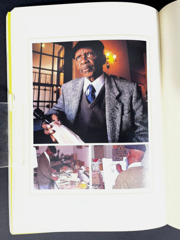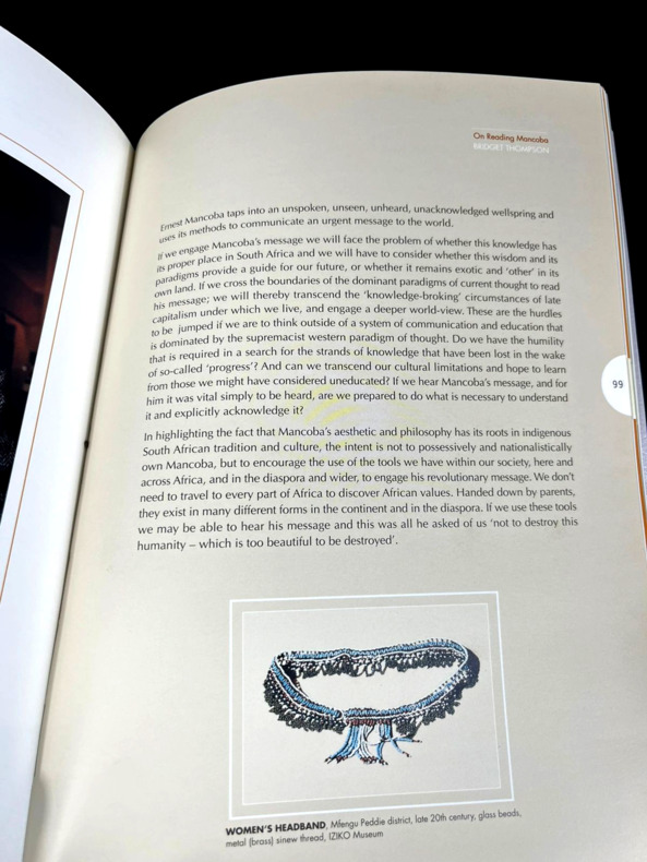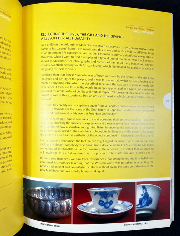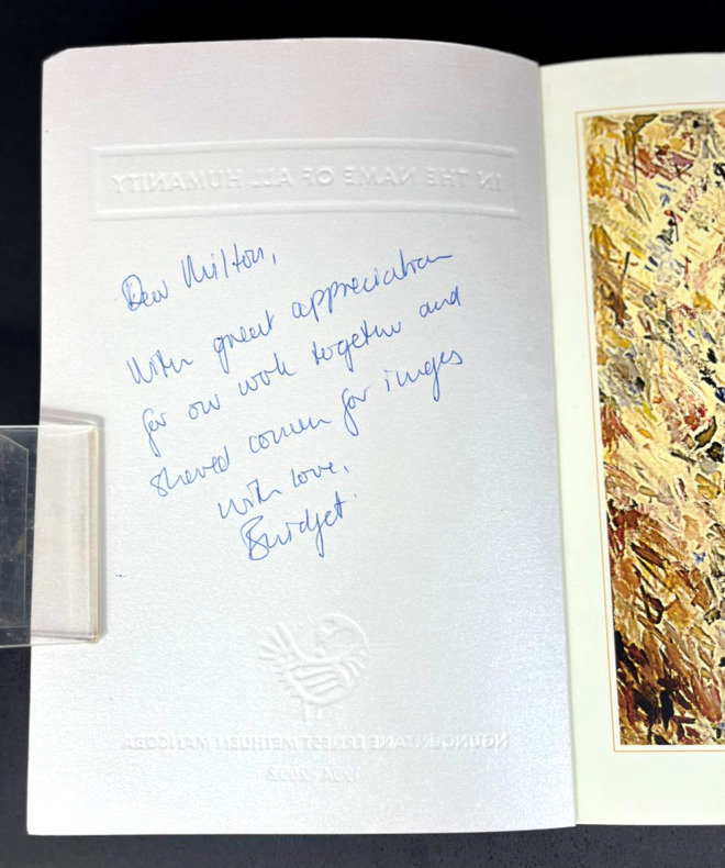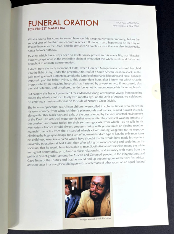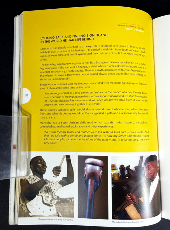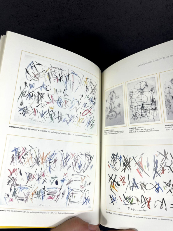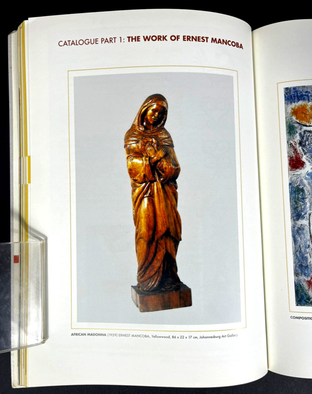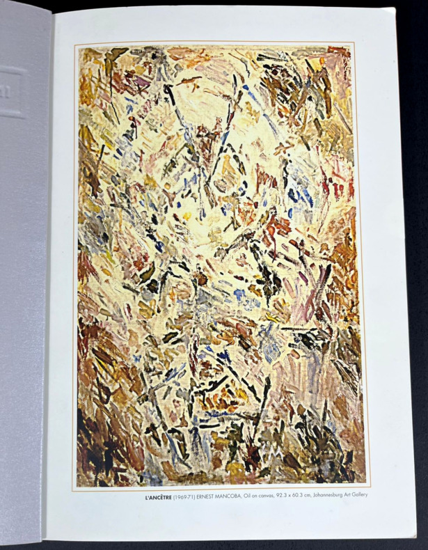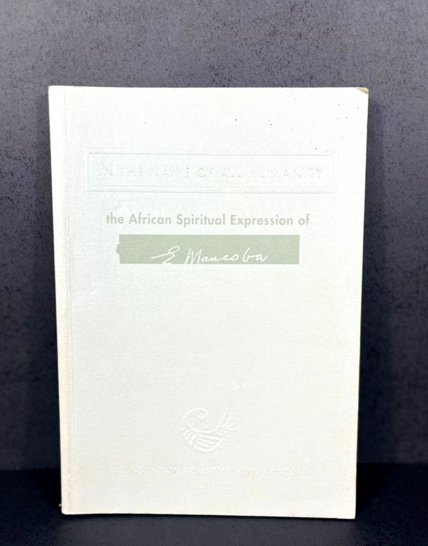 Johannesburg, Art and Ubuntu Trust, 2006. In-8 booklet, 17 x 24 cm, 126 pp. Softcover with rigid silver metal-like covers. Handwritten mention "NEW AFRICAN ARTISTS - ERNEST MANCOBA" on the spine. Book is SIGNED by curator Bridget Thompson on the back of the front cover: "Dear Milton, With great appreciation for our work together and [illegible] for images, with love, Bridget". Printed on coated glossy paper, numerous artworks by Ernest Mancoba showcased, texts by various authors including the Ambassador of Denmark Torben Brylle and the "Funeral Oration" said in honor of the artist on November 2, 2022. "In the Name of All Humanity: The African Spiritual Expression of E. Mancoba" was a landmark 2006–2007 exhibition and catalogue curated by Bridget Thompson, highlighting South African artist Ernest Mancoba's synthesis of African spirituality, humanity, and Western modernism. It showcased his life's work as a vision of global unity rooted in the proverb “umuntu ngumuntu ngabanye abantu” (a person is a person because of other people).