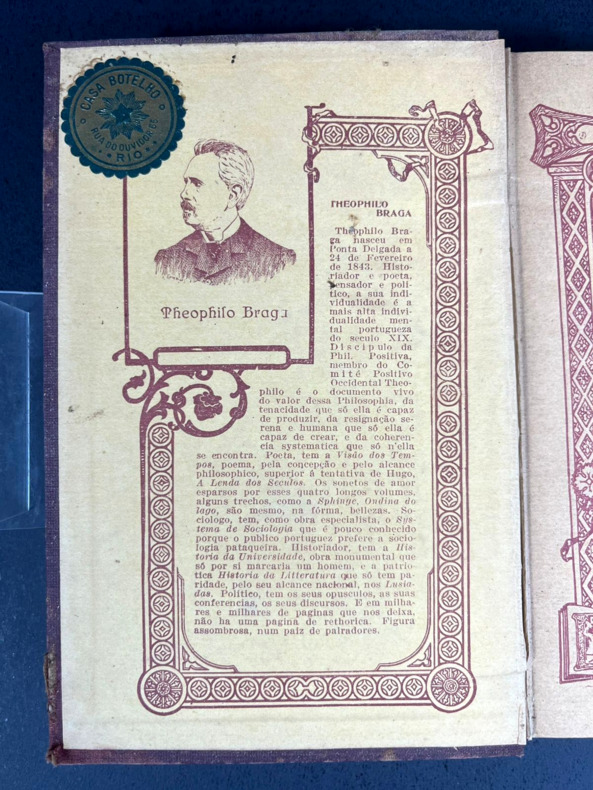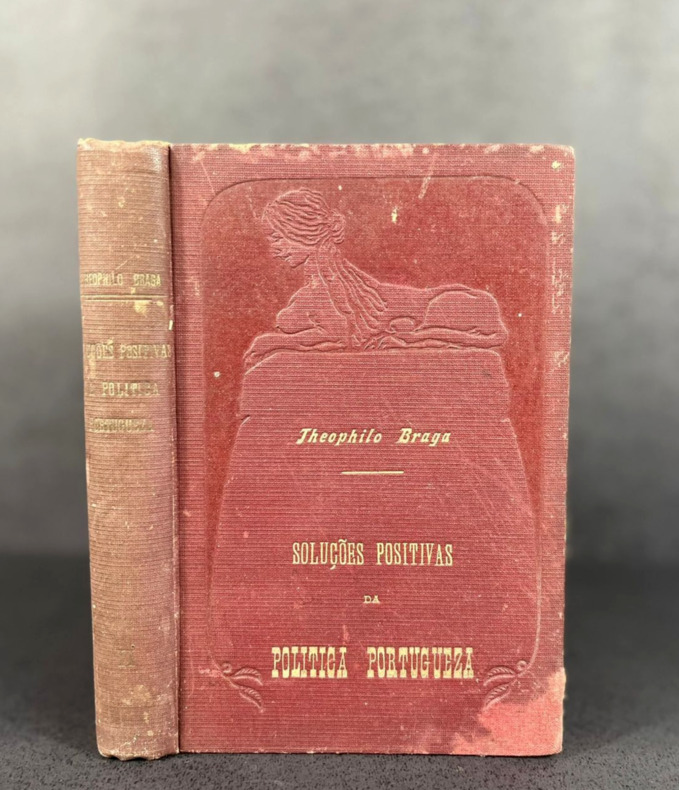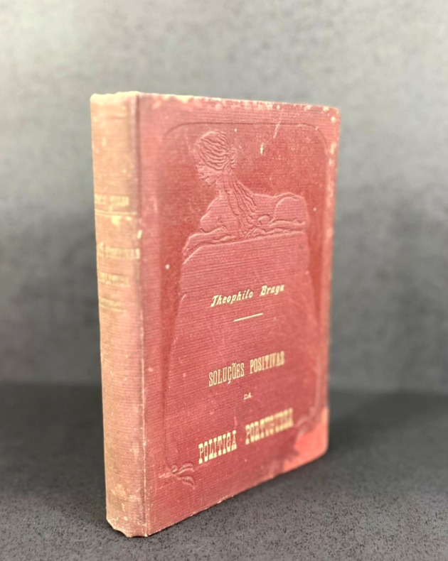 Papel amarelado, manchas de descoloração na capa e na lombada. Selo da editora atrás em relevo, leve fissura abaixo da dobradiça de trás. Raro volume de ensaios de um dos maiores pensadores positivistas portugueses da Belle Époque.