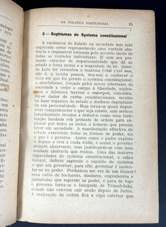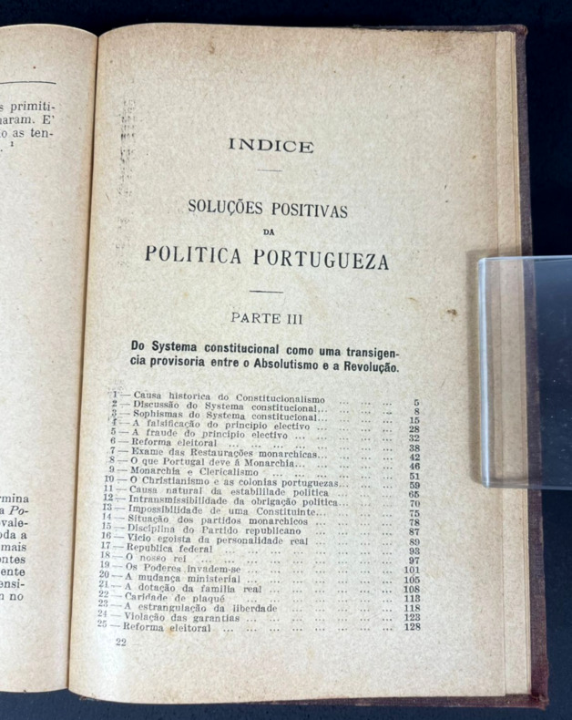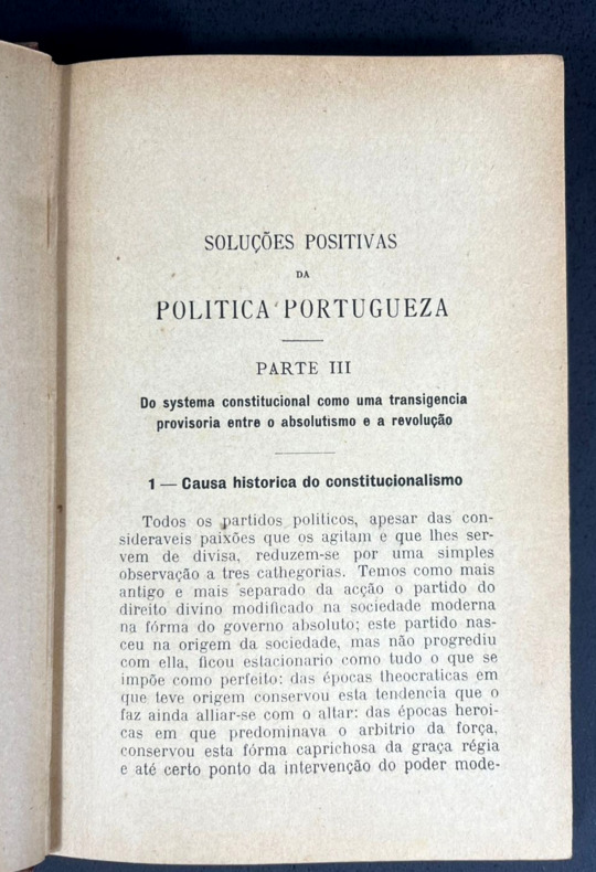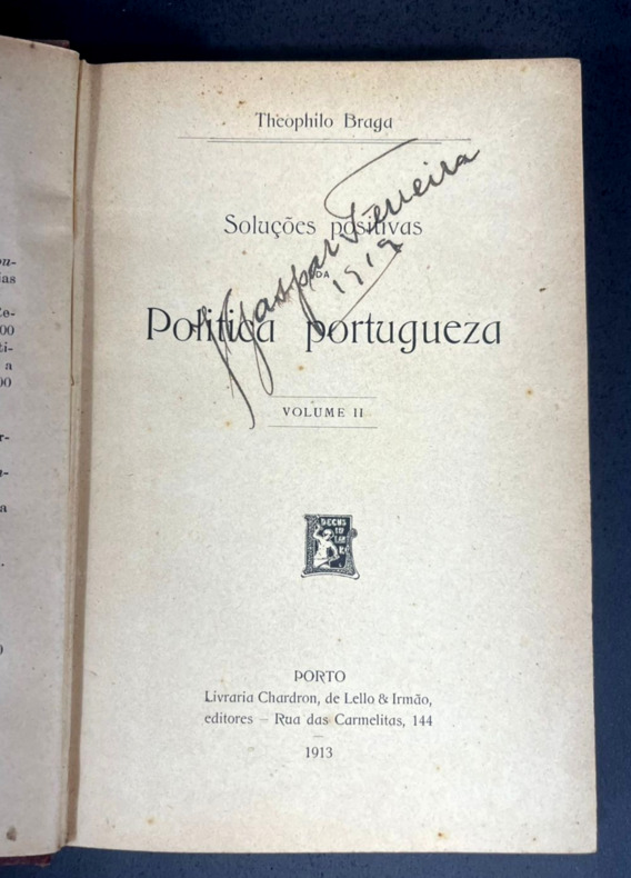 Porto, Chardron, de Lello & Irmão, 1913. Um volume só. Encadernação capa dura em pleno tecido roxo da editora. Um esfinge na capa da frente com título tipografado em ouro. In-12, 12 x 18 cm, 338 pp. Páginas de guarda iniciais com retrato, biografia e lista de obras do autor numa ornamentação vermelha sob fundo amarelo, e desenho do prédio da livraria editora na contracapa traseira. Etiqueta de livraria brasileira na contracapa da frente. Aqui são duas partes: a terceira, "Do Systema constitucional como uma transigencia provisoria entre o Absolutismo e a Revolução", e a quarta, "A Questão religiosa em Portugual".