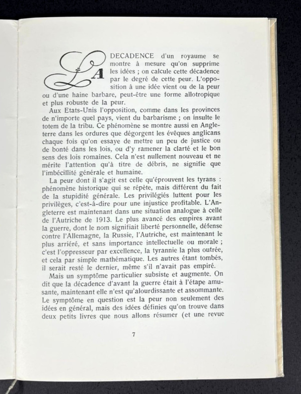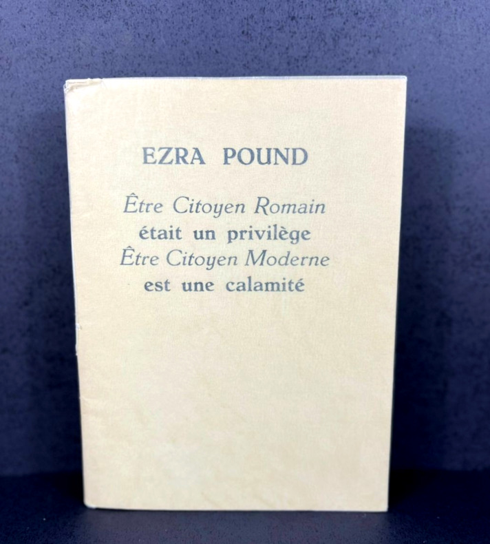 Liège, Dynamo, 1965. Édition originale brochée de ce texte écrit directement en français par l'auteur en juillet 1921. L'un des 51 exemplaires sur vélin blanc, directement numéroté de la main de l'éditeur Pierre Aelberts en fin d'ouvrage. 142 x 194 mm, (1 ff.) 13 p. ( 2 ff.) Broché remplié sous papier transparent. Menues notes au crayon sur la garde blanche. Portrait de l'auteur en frontispice. Colophon en fin d'ouvrage. Exemplaire rare et précieux de ce texte de jeunesse d'Ezra Pound (1885-1972). Poète, critique sans concession de son temps, Pound se sert ici de l'Empire romain comme d'un contrepoint au monde moderne : Rome était le lieu d'une citoyenneté verticale, méritée, exclusive, quand le monde moderne qui en a gardé les formes n'a plus que des administrés, des individus dépourvus d'identité, simples sujets d'une machine juridique inculte et dépourvue de valeurs. Joignant l'action à la parole, Pound quitta son relatif confort américain pour s'engager en faveur de Mussolini en Italie, ce qui lui valut d'être arrêté en 1945, d'être déclaré fou et de passer 13 ans en prison ou dans un asile avant d'être libéré en 1958. Aujourd'hui méconnu, Ezra Pound fut pourtant l'un des poètes les plus remarquables de son époque en même temps qu'un intellectuel bouillonnant quoique parfois brouillon : il fut le mentor d'Eustace Mullins, provoqua par son épopée des Cantos l’œuvre du poète communiste Pablo Neruda et annonçait la critique d'une modernité niveleuse propice à l'élimination de la qualité au profit de la quantité qu'on trouvera chez Julius Evola ou René Guénon.