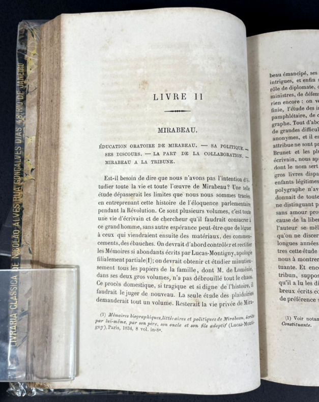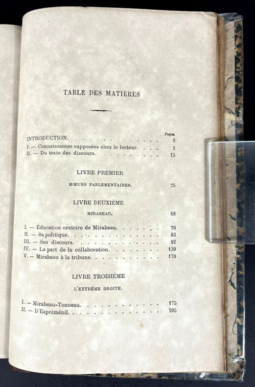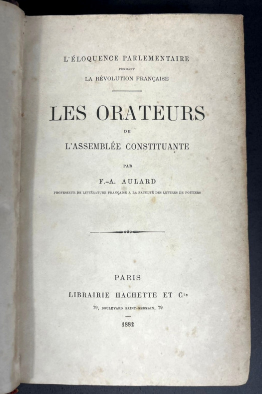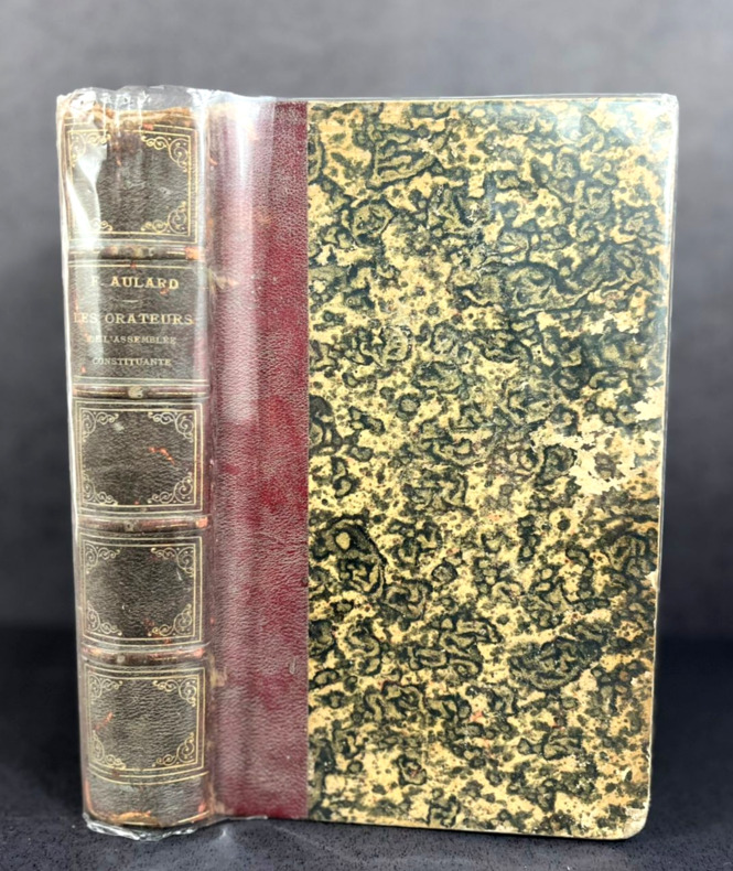 Paris, Hachette, 1882. Édition originale. Premier des deux volets du diptyque "L'éloquence parlementaire pendant la Révolution française", nettement moins courant que le suivant, Orateurs de la Législative et de la Convention (1885), paru en deux volumes. Un épais volume de 148 x 222 mm pour 569 pp. Relié demi-chagrin grainé rouge foncé. Dos à 4 nerfs plats, doubles caissons dorés à motifs floraux préfigurant l'Art nouveau en coin, nom d'auteur et titre en doré. Mylar protecteur. Indication d'ancienne librairie classique à Rio de Janeiro en doré à la bordure du contreplat, gardes colorées marbrées, ex dono à la plume en portugais brésilien : "A meu bom amigo..." (À mon bon ami...) daté de 1889 à la garde blanche. Introduction, Mœurs parlementaires, Mirabeau, L'extrême droite, La droite, Le centre droit, Les constitutionnels, Le triumvirat, L'extrême gauche. Table des matières en fin d'ouvrage. Historien sérieux, mais engagé, Alphonse Aulard se fit une réputation avec sa thèse de doctorat (l'une en latin, l'autre en français) et surtout avec ses travaux documentés sur les acteurs du parlementarisme de la Révolution française. Positiviste, à gauche mais considéré comme au centre, Aulard fut mal perçu par les étudiants catholiques favorables au clergé et à la contre-révolution, et surtout par son ancien étudiant Albert Mathiez, communiste et admirateur de Robespierre, qui lui reprocha son parti pris contre ce dernier. Aulard tenta une critique sur les sources de l’œuvre d'Hippolyte Taine, sceptique à l'égard du récit républicain, mais se fit lui-même reprendre par l'historien Augustin Cochin. Propagandiste du néo-jacobinisme maçonnique ou historien, sa place reste nettement plus controversée qu'il ne l'aurait voulu.