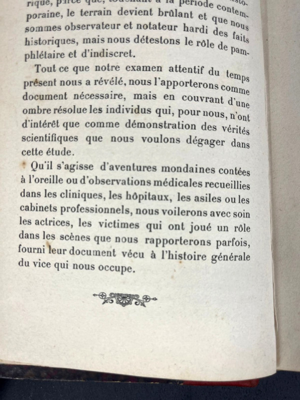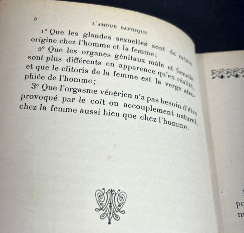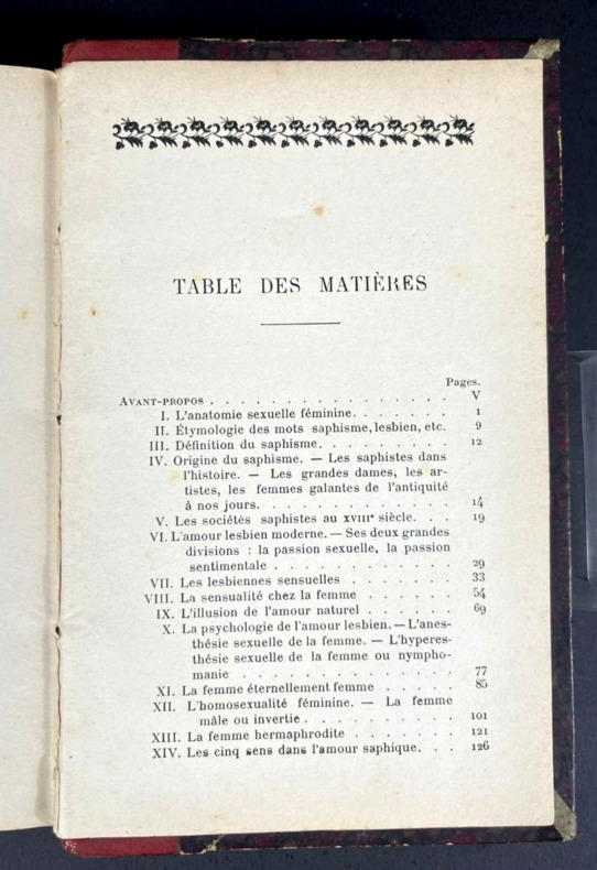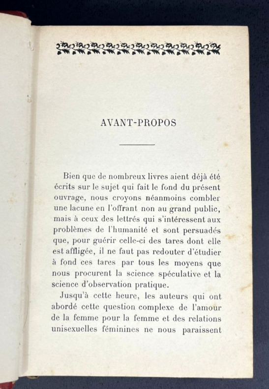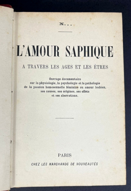 Paris, Chez les marchands de nouveautés, sans date [1906]. Seule et unique édition. Un volume in-12 de 125 x 182 mm, (xii) 284 pp. 35 chap. Relié demi-cuir rouge foncé, dos à 4 nerfs, quatre fleurons dorés, titre en doré. Plats rouges sombres, gardes colorées marbrées aux veines turquoises. Avant-propos en début d'ouvrage, table des matières à la fin. À noter des culs-de-lampe et des frises différentes pour chaque chapitre. Ce livre documentaire, qui mêle une valeur médicale ou physiologique à des recherches culturelles et à un certain jugement social, a été quelquefois attribué à Liane de Pougy, qui avait publié en 1901 le roman Idylle saphique. Pour autant, la façon d'aborder le sujet n'est pas la même et autant Liane de Pougy n'a jamais ni confirmé ni infirmé avoir écrit L'amour saphique, autant la différence marquée de style et de point de vue ferait plutôt pencher pour un autre auteur qui n'a jamais revendiqué son œuvre.