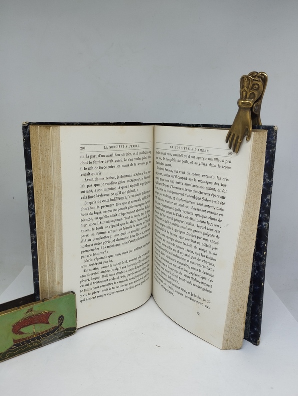 Paris, Collection Hetzel, s.d. (1862). Un volume in-12, demi-basane violette (reliure de l’époque). Couvertures non conservées. 2 ff., 319 p. (table des matières au verso). 108x176 mm. Quelques rousseurs au début (peu) Certainement la première parution en librairie de la traduction de Paul-Émile Daurand-Forgues, alias Old Nick, de « La sorcière à l’ambre », du théologien allemand Wilhelm Meinhold. Cette longue nouvelle publiée à Berlin en 1843 traite des démêlés tragiques d’une jeune femme accusée de sorcellerie au début du dix-septième siècle. La traduction entière du titre est : « Marie Schweidler, la sorcière de l’Ambre-Jaune, le plus intéressant de tous les procès de sorcières connus jusqu’à ce jour, d’après un manuscrit défectueux de son père le ministre Abraham Schweidler, publié par le ministre, docteur W. Meinhold. » D’abord proposé à un journal viennois dans une version plus courte, et accepté pour publication, ce texte avait été interdit par la censure à trois reprises en 1826 et 1827. L’auteur l’avait alors mis de côté, oublié, et était retourné à ses études de théologie. Des années plus tard, Meinhold reprit son texte et le réécrivit dans un style tel que toute la critique crut à l’authenticité de sa narration, ce qui lui permit de ridiculiser certaines personnes à qui il reprochait leur manque de rigueur intellectuelle : « Si la critique contemporaine prétend que, sur les simples expressions et les locutions de l’Ecriture-Sainte, on peut fonder des opinions certaines par rapport à l’auteur d’un écrit et à l’époque de son origine, elle n’a plus qu’à rougir d’elle-même, puisqu’il est constaté que du style et des locutions de ma Sorcière de l’Ambre-Jaune elle n’a point su conclure quel était l’auteur de l’ouvrage, pas plus que l’époque où il avait été composé [...] Si la critique contemporaine a le front de s’aventurer jusqu’à prendre pour un roman toute l’histoire de J.C., histoire qui repose sur des preuves plus solides et plus incontestables que tout autre fait historique quel qu’il soit, n’a-t-elle pas à rougir encore bien davantage, après qu’elle a pris pour une histoire véritable le roman du docteur Meinhold dont rien cependant ne garantissait l’authenticité? » Pourtant, même après qu’il eut dévoilé la vérité, on continua de soutenir que son histoire était vraie. Source : « Revue Catholique, Recueil Religieux, Philosophique, Scientifique, Historique et Littéraire », tome deuxième (année 1844-45), Liège, 1845. Forgues annonce sur le titre les deux textes comme étant des imitations de l’anglais. La Sorcière occupe 166 pages. Cette traduction avait été pré-publiée en 1844 dans la Revue Britannique. Lovecraft appréciait ce texte, « autre exemple même [avec Ondine] de ce que le génie germanique peut produire de meilleur dans le genre fantastique au XIXème siècle. » Elsie Venner, d’Oliver Wendell Holmes, n’est pas moins intéressante : Xavier Legrand-Ferronnière indique que l’auteur était « l’un des médecins-écrivains les plus connus dans le monde anglo-saxon, le premier sans doute à avoir traité les questions psychiatriques par la science-fiction dans Elsie-Venner (1859), The Guardian Angel (1867) et A Mortal Antipathy (1884) ». (Le Visage Vert, janvier 1997 : n°2 de la Nouvelle Série)