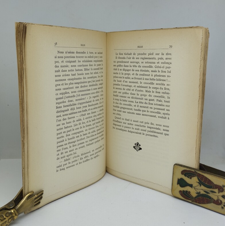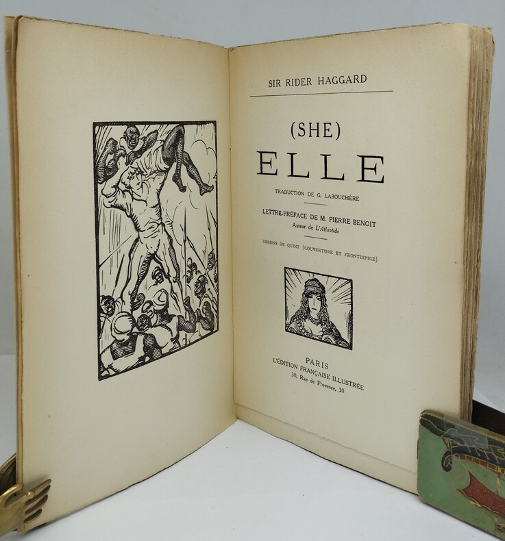 Traduction de Georges Labouchère, Paris, L’Édition française illustrée, 1920. Un volume broché. 1 ff. blanc, 1 ff. (justification), 1 ff (faux titre et frontispice), titre, Lettre préface de Pierre Benoît, auteur de L’Atlantide, note de l’éditeur, 280 p. Un des 60 exemplaires sur pur fil Lafuma, après 40 Hollande, seuls grands papiers. 197×130 mm. Édition originale française de ce roman paru en 1887. She, c’est Elle-qui-doit-être-obéie, la reine d’un royaume souterrain, en Afrique, qui « attendit pendant deux mille ans l’homme qu’elle aimait et ne consentit à mourir qu’après l’avoir retrouvé » (Francis Lacassin). C’est aussi un livre qui, dès la première page, plonge le lecteur dans l’univers du roman d’aventure – la grande – et le fantastique. She est le premier roman du cycle d’Ayesha, dont la rencontre avec celui d’Allan Quatermain, inauguré quant à lui en 1885 par King Solomon’s Mines, fut consacrée en 1921 dans She and Allan. Le cycle de She, composé de ces deux romans ainsi que de Ayesha, the Return of She (1905, traduit en 1926 sous le titre Aycha) et Wisdom’s Daughter (1923 ; La fille de la Sagesse, 1926), a donné lieu à une dizaine d’adaptations au cinéma, la première en 1899 (La danse du feu, par Méliès ; durée : 1 minute). She and Allan ne fut traduit qu’en 1982. Cette première édition fut mise en œuvre dans un contexte un peu particulier : lorsque parut le roman L’Atlantide, son auteur, Pierre Benoît, fut accusé de s’être inspiré de She. Il répondit à ses détracteurs qu’il était incapable de lire l’anglais mais ceux-ci découvrirent la traduction de Georges Labouchère, initialement parue dans la presse une vingtaine d’années plus tôt. Cela relança la polémique et L’Édition Française Illustrée réédita alors cette traduction, « la seule qui ne puisse être taxée de partialité », en l’accompagnant d’une lettre-préface de Benoît et d’une Note de l’Editeur. Les lecteurs eurent ainsi le loisir de comparer les deux textes. Il existerait en tout onze traductions françaises de ce roman, la deuxième chez Crès, quelques mois après celle-ci. Dos légèrement gauchi, brochage et pages jaunies aux bords, une petite trace d’humidité au premier plat.