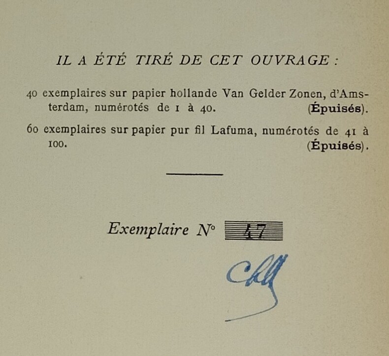Traduction de Georges Labouchère, Paris, L’Édition française illustrée, 1920. Un volume broché. 1 ff. blanc, 1 ff. (justification), 1 ff (faux titre et frontispice), titre, Lettre préface de Pierre Benoît, auteur de L’Atlantide, note de l’éditeur, 280 p. Un des 60 exemplaires sur pur fil Lafuma, après 40 Hollande, seuls grands papiers. 197×130 mm.