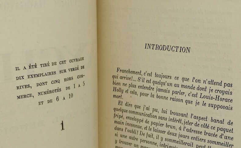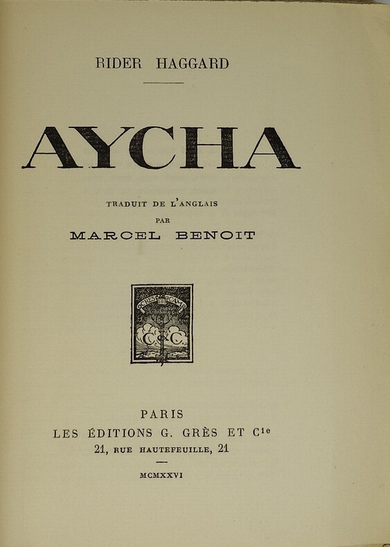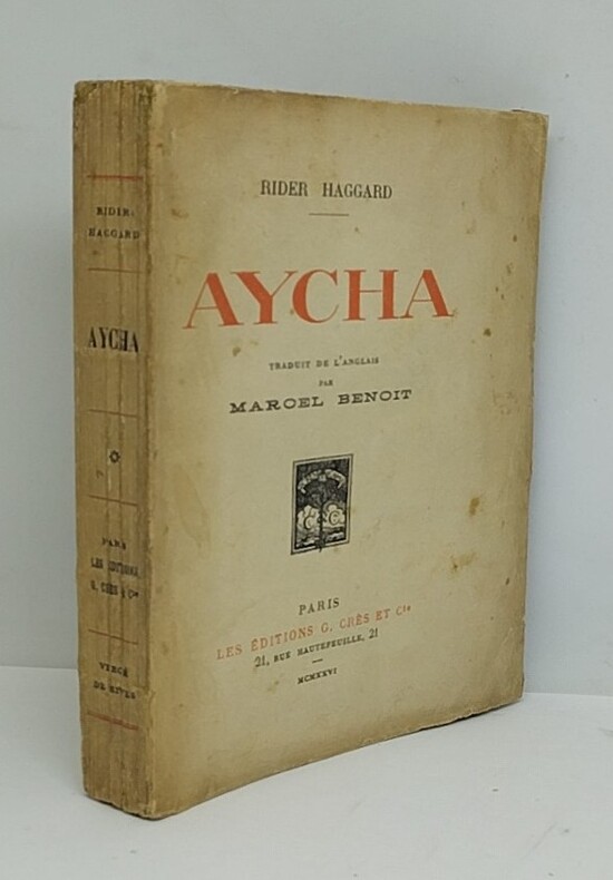 Traduit de l’anglais par Marcel Benoit. Paris, Crès, 1926 (AI : 22 mai). Un volume broché. 1 ff. blanc, faux-titre, titre, vi, 274 p., 2 ff. (dont la table). 140×187mm. Édition originale française. Un des dix Vergé de Rives, seul grand papier (le N° 1). Brochage restauré, couverture salie, dos un peu gauchi, une tache en marge de quelques feuillets mais très bon état intérieur. Aycha est la traduction de Ayesha, the Return of She (1905), deuxième titre du cycle de She. Dans ce roman qui se passe vingt ans après les aventures qui font l’objet de She, Léo Vincey et Holly, persuadés que la reine n’est pas morte, partent à sa recherche. Ils la retrouvent au Tibet, réincarnée…