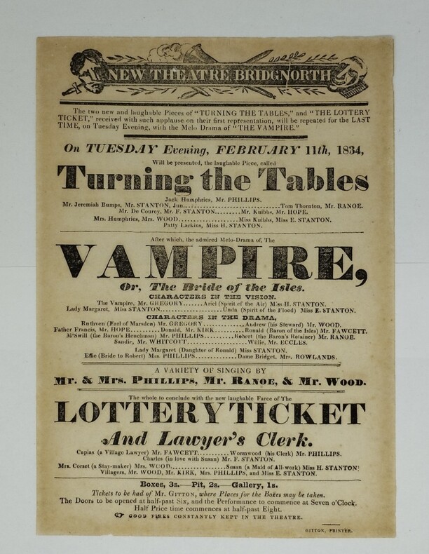 Affiche publicitaire anglaise pour le New Theatre de Bridgnorth, imprimée au recto, annonçant pour le 11 septembre 1834 une représentation de The Vampire or the Bride of the Isles. (environ 178×248 mm). Cette pièce de James Robinson Planché est une adaptation du Vampire de Nodier, dont la première représentation eut lieu le 13 juin 1820. L’auteur anglais y a apporté quelques modifications. Il semble que The Vampire or the Bride of the Isles ait obtenu sa licence d’exploitation le 25 juin. La pièce devait être représentée la première fois le 7 août 1820 à Londres mais en raison du décès de la duchesse d’York, la première fut reportée de deux jours. Le rôle du vampire fut tenu par un acteur nommé T. P. Cooke, qui allait jouer trois ans plus tard la créature de Frankenstein dans la première adaptation théâtrale britannique du roman de Mary Shelley ainsi que dans la version française de celle-ci. Notons également que c’est à l’occasion de la mise en scène de cette pièce qu’aurait été mis au point un procédé utilisant une trappe pour escamoter un personnage. Deux autres pièces sont annoncées sur l’affiche. Source : une fiche de la librairie américaine D&D Galleries. Concernant la licence d’exploitation, il est indiqué : « According to the Huntington Library’s Larpent collection, the play was licensed June 25th, 1820 ».