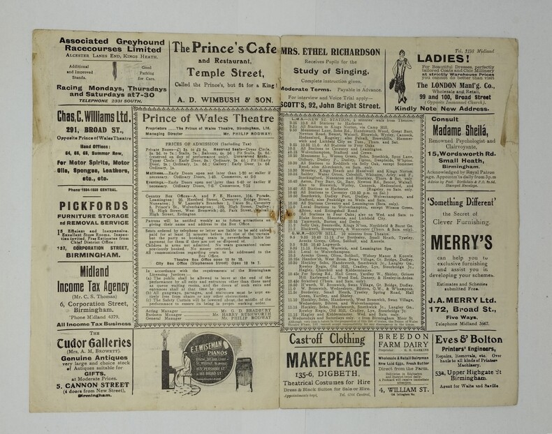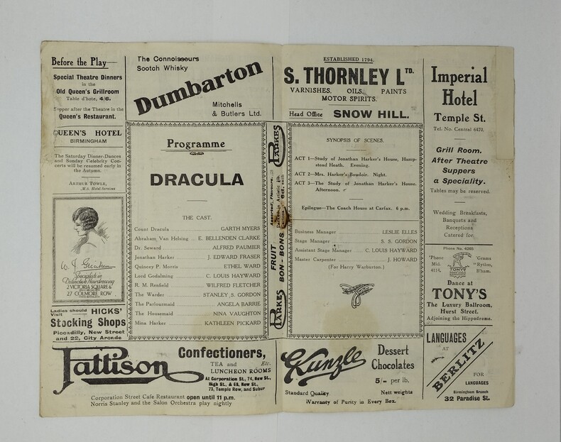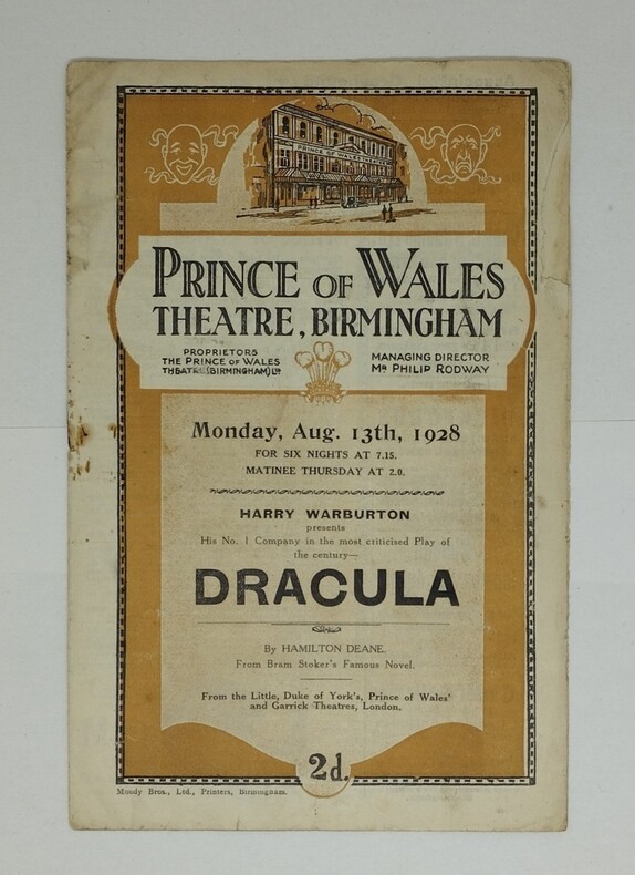 Programme du théâtre Prince of Wales de Birmingham annonçant une série de six jours de représentations de Dracula, par Hamilton Deane, à partir du lundi 13 août 1928. 4 feuillets d’annonces. 141×218 mm. Exemplaire fatigué (pliures, papier froissé, agrafe rouillée et détachée, petites restaurations en marge). Le premier plat, en couleurs, est consacré à Dracula. Les pages suivantes livrent notamment la liste des acteurs et font la publicité de deux autres pièces, de divers restaurants, concessionnaires automobiles… Bram Stoker (1847-1912), avant tout homme de théâtre, régisseur du Lyceum Theater de Londres, que dirigeait Henry Irving, n’envisageait pas de postérité pour son roman malgré l’accueil plutôt satisfaisant du public et de la critique. C’était un écrivain non professionnel qui, de son propre aveu, estimait avoir publié « un récit de terreur à deux sous ». Il pensait en revanche que l’on pouvait en tirer une pièce de théâtre à succès et il écrivit celle-ci en 1897, considérant que le rôle de Dracula était fait sur mesure pour Irving. Ce dernier se montra réticent et l’auteur, manquant peut-être de conviction quant aux chances de mener à bien son projet, renonça. Bien plus tard et longtemps après son décès, Florence, sa veuve, accepta de vendre les droits d’adaptation du roman à Hamilton Deane, qui dirigeait une troupe d’acteurs. Deane avait fait partie de celle d’Irving ; il avait conçu le projet d’adapter le roman plusieurs années auparavant. Sa famille et celle de Bram Stoker se connaissaient. La pièce fut d’abord représentée en province, à partir de 1924, puis à Londres au bout de trois saisons. Elle connut un très grand succès populaire et fut adaptée la même année aux États-Unis, avec un scénario modifié selon le goût du public américain. Un certain Béla Blaskó, un acteur peu connu, originaire de Lugos, en Hongrie, triompha ainsi à partir d’octobre 1927 sur les scènes américaines, avant d’apparaître aux yeux du monde entier en 1931, dans le film de Tod Browning, sous le nom de Bela Lugosi. L’habit de soirée et la cape de l’acteur, indissociables aujourd’hui de l’image du vampire, avaient été imposés par Deane, qui cherchait à adapter au mieux son personnage à la société londonienne. La cape était par ailleurs utile lorsque Dracula disparaissait dans une trappe de la scène – ce type d’escamotage avait été inventé en 1820 à l’occasion des représentations de The vampire or the bride of the isles. Notons que quelques personnes de l’entourage de Bela Lugosi avaient eu l’occasion de travailler sur le thème du vampire avant que l’acteur hongrois n’interprétât le comte. Ainsi le futur Dracula avait-il partagé en 1917 l’affiche d’un film avec Károly Lajthay, qui allait réaliser quelques années après Drakula Halála [1921] ; il avait aussi fréquenté, quand il vivait encore en Hongrie, l’auteur (présumé) de la novellisation de ce film, Lajos Pánczél. Enfin, il tourna sous la direction de Murnau une adaptation non autorisée du Jekyll de Stevenson, deux ans avant Nosferatu [1922] (tandis que Max Schreck, l’interprète du vampire dans ce film, joua pour sa part en 1920 et 1922 dans deux films de Fred Stranz, le réalisateur de Der Vampyr [1920]). Nous ne sous-entendons pas que la participation de l’acteur hongrois à la pièce a un lien probable avec les faits précédents, mais il n’empêche que ce dernier pourrait avoir été conseillé par l’une de ces personnes, ou même, seulement, avoir été influencé ou sensibilisé par leur travail. Toutes étaient encore en vie à cette époque. L’immense succès du film de Tod Browning, réalisateur en 1927 de London after midnight, eut un rôle déterminant dans le développement de la littérature vampirique aux États-Unis, qui, avant cette époque, se limitait semble-t-il à très peu de titres ; la célèbre nouvelle For the blood is life (1905) de F. M. Crawford et The House of the vampire de G. S. Viereck (1907), sont à cet égard des exceptions. Cette carence avait commencé de s’atténuer à partir de 1925 tandis que, parallèlement à l’émergence du cinéma d’horreur, une littérature fantastique originale se développait dans les pulps. Cependant, ce n’est qu’après le film que « des dizaines et des dizaines » d’histoires parurent dans ces publications populaires à coût modique, qui bénéficiaient de forts tirages. Beaucoup d’entre elles virent le jour dans le fameux Weird Tales. (voir notre intoduction) Sources : à l’exception des anecdotes sur l’entourage de Bela Lugosi, tout ce qui précède est extrait de : Jean Marigny (Un vampire renaît de ses cendres, in Dracula [pages 26-37] ; Le Vampire dans la littérature anglo-saxonne, pages 4, 122, 139-158, 180, 410-412, 807 ; Le Vampire dans la littérature du XXe siècle, pages 16-19 et 290). Pour les anecdotes en question, voir G. D. Rhodes : Drakula Halála (1921): The Cinema’s First Dracula, Horror Studies 1 : 1, pages 2 et 25-47, doi: 10.1386/host.1.1.25/1 (janvier 2010). thebioscope.net ; 18 janvier 2008, et Internet.