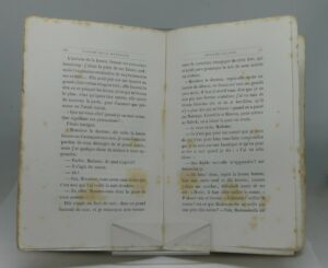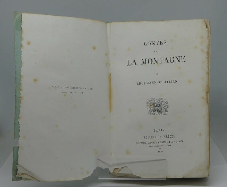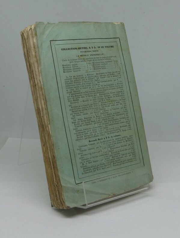 Paris, Michel Lévy frères, 1860 (Collection Hetzel). Un volume broché, 345 p., 1 ff. (table), puis le catalogue de l’éditeur (4 ff.) 120×186 mm. Manques de papier à la couverture, au faux-titre, au titre et, de façon très marginale, au second plat de la couverture. Rousseurs. Bon exemplaire cependant, rare en condition de parution comme ici.