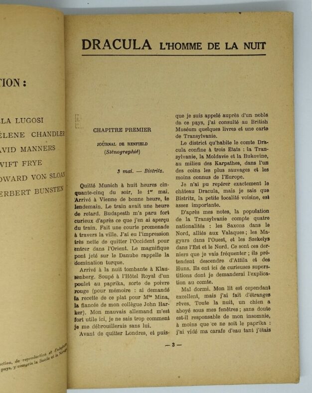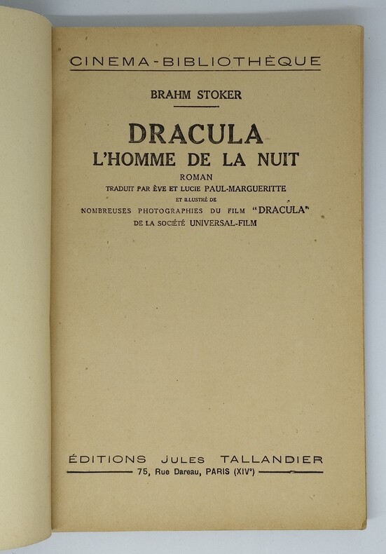 Traduit par Eve et Lucie Paul-Margueritte et illustré de nombreuses photographies du film « Dracula » de la société Universal-Film. Tallandier ; collection Cinéma-Bibliothèque, numéro 523 (s. d., 1932). Prix : 3,50 francs. Broché, 92 pages et 2 ff. (prochaines parutions et catalogue de l’éditeur). Restauration discrète au dos, et sur la partie inférieure des plats, près des mors. 241×159 mm. Bon exemplaire. Novellisation du Dracula de Tod Browning avec Bela Lugosi, parue durant la deuxième quinzaine de juin. Le film était sorti en France quelques mois plus tôt. On y trouve une trentaine de photos. En dehors de petites adaptations nécessitées par le film (dans celui-ci, c’est Renfield qui se rend au château, et non pas Harker, donc, par exemple, les deux noms ont été permutés), le texte semble presque identique à celui de l’originale de 1920. Cette édition est très rare, bien plus nous semble-t-il que l’originale de 1920. Plus d'informations sur notre site : https://livres-rares-imaginaires.com/ (catégorie Vampirisme – Littérature – après 1900)