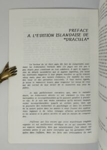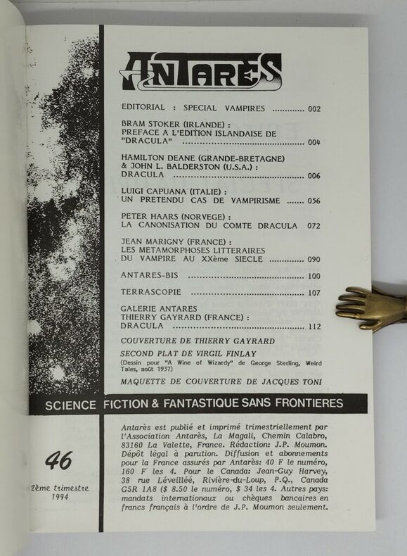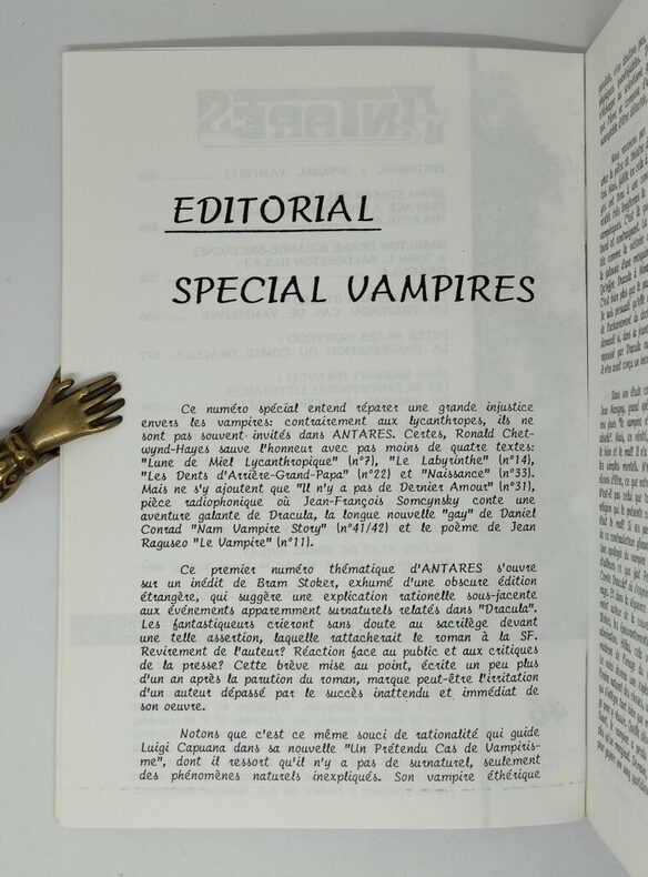 Un volume broché de 120 pages. 170×246 mm. Excellent état. Les pages 4-5 livrent la traduction française de la préface de la version islandaise de Dracula. Intitulé Makt Myrkranna, c’est-à-dire « Pouvoirs des Ténèbres », l’ouvrage en question, qui était alors ignoré en France, est qualifié d’« obscure édition étrangère » dans l’éditorial du numéro ; on ne pouvait pas imaginer qu’une dizaine d’années plus tard, ce livre allait faire naître un débat très intense : Makt Myrkranna parut d’abord dans la presse à partir de janvier 1900, puis en librairie en 1901. Ce texte beaucoup plus court que le roman original ne fut mis au jour qu’en 1986, lorsque l’anthologiste et collectionneur Richard Dalby publia une traduction anglaise de sa préface. Il fut alors considéré comme la plus ancienne traduction du roman, détrônant l’allemande (1908). C’est certainement sur la version de Dalby* que s’est basé George W. Barlow, le traducteur d’Antarès. La publication de l’anthologiste fut d’autant plus commentée à l’époque qu’elle amenait à s’interroger : Bram Stoker n’a pas écrit de préface pour l’originale de 1897 et, de plus, celle de Makt Myrkranna, datée d’août 1898 et signée de son nom, mentionne Jack l’éventreur, pourtant absent de Dracula. Etonnamment, chacun s’en tint à la supposition de Dalby, à savoir que la version islandaise n’était qu’une simple traduction abrégée. C’est seulement en 2014 qu’un chercheur, Hans Corneel de Roos, décida d’étudier de plus près le texte islandais. Il en publia une retraduction anglaise en 2017 : Powers of Darkness. Celle-ci faisait apparaître de profondes différences avec le texte livré par Stoker en 1897. Cette version nordique était-elle basée sur les premières ébauches de l’auteur britannique ? Bram Stoker avait-il joué un rôle dans sa publication ? Autant de questions légitimes… Cependant, la publication médiatisée de H. C. de Roos attira immédiatement l’attention d’un certain Rickard Berghorn, qui fit le rapprochement avec une version suédoise dont il avait entendu parler. Intitulée Mörkrets Makter (« Pouvoirs des Ténèbres », également), elle était parue à deux reprises dans la presse entre 1899 et 1900 : dans sa version intégrale (texte bien plus que long que celui de 1897) et sous une forme abrégée. Berghorn établit que ce n’est pas l’originale anglaise, mais ce texte – dans sa forme la plus courte –, qui constitue la source de Makt Myrkranna (qui procède à son tour à une réduction). Autrement dit, l’édition méritant toute l’attention n’était plus l’islandaise, qui venait d’être révélée, mais la suédoise. Il s’ensuivit un débat, ponctué d’articles et de conférences, destiné à déterminer l’origine de cette version qui diverge au plus au point de l’originale (elle recèle une forte charge érotique insufflée par la présence d’une femme vampire blonde qui s’acharne à séduire Harker, mais aussi à le corrompre ; surtout, le fait que Dracula conspire avec des politiques afin de faire émerger un nouvel ordre mondial basé sur un « darwinisme social » est largement développé). Ces recherches, un temps prometteuses en raison du caractère pour le moins troublant de certains faits, n’ont pas permis de conclure à l’existence d’un quelconque lien entre Bram Stoker et ces publications nordiques. Désormais, on s’accorde plutôt à privilégier l’hypothèse – la plus plausible a posteriori, une fois l’engouement légitime et l’effet de surprise dissipés –, que Mörkrets Makter n’est qu’une simple édition pirate conçue entièrement à l’insu de l’auteur de Dracula. D’ailleurs, H. C. de Roos a constaté que sa préface plagie un livre paru en Suède trois mois auparavant, et que le récit semble avoir subi l’influence de ce texte antérieur. Notons qu’une traduction hongroise plus ancienne (fidèle pour sa part au texte original), d’abord parue en périodique à partir de janvier 1898, puis en volume la même année, a été signalée à son tour en 2010 par un universitaire hongrois, Jenő Farkas. La première sérialisation américaine est quant à elle connue depuis 2017, découverte par David Skal. Cela étant, compte tenu de l’importance de Dracula, c’est peut-être le caractère très tardif de toutes ces découvertes qui, au fond, est le plus remarquable. Dans le cas des éditions nordiques, il s’explique par la rareté des éditions, par la barrière linguistique [à laquelle ont notamment fait face Dalby puis De Roos], par le fait, dans le cas de Mörkrets Makter, qu’il n’y eut pas de publication en librairie, et enfin par un certain manque d’intérêt pour cette littérature dans les pays nordiques (ces versions n’y étaient pas tout à fait inconnues, au moins de quelques universitaires, mais personne n’y prêtait attention). Notons enfin, bien que cela soit secondaire, que le nom de H. P. Lovecraft apparut dans les discussions. Dans une lettre datée de 1923, l’écrivain américain indique en effet que trente ans auparavant, Stoker a contacté une de ses amies pour un travail de révision de son manuscrit. On trouve également dans ce remarquable numéro la traduction de l’adaptation américaine de la pièce d’Hamilton Deane (Dracula), jouée à partir de 1927. Il s’agit sans doute de l’originale française. Une nouvelle de l’Italien Capuana, parue en 1904, traduite la première fois en 1961 sous le titre Le mari vampire, figure aussi, dans une nouvelle traduction. Voir les interviews et articles de H. C. de Roos, accessibles sur les sites vampirisme.com (taper « roos » dans le moteur de recherche) et vampvault.jimdofree.com, ainsi que la page Wikipédia de Mörkrets Makter. Ces différentes sources sur lesquelles nous nous sommes basé fournissent beaucoup de détails que l’on ne trouvera pas ici.