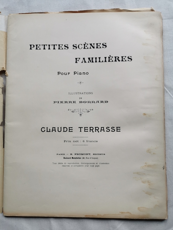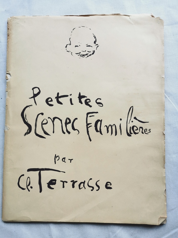 Paris, E. Fromont, [1893]. Un volume in-folio (350 x 270 mm), en feuilles, 2 ff.n.ch., 61 pp., couverture de papier crème illustrée d'une lithographie. Édition originale de ce recueil de partitions pour piano composé par Claude Terrasse (1867–1923). Cet ouvrage est un des deux livres d’initiation à la musique pour les enfants que Pierre Bonnard publia en collaboration avec son beau-frère, le musicien Claude Terrasse. Il rassemble 15 pièces "familières" et 4 pièces "humoristiques", illustrées par 20 LITHOGRAPHIES ORIGINALES DE PIERRE BONNARD dont une orne la couverture, tandis que les autres introduisent chaque partition. Particulièrement recherché, ce livre marque une étape majeure dans la carrière de Bonnard puisqu’il s’agit du tout premier ouvrage qu’il ait illustré. L’artiste, beau-frère de Claude Terrasse, y déploie un style à la fois poétique et intimiste, annonçant déjà le génie qui caractérisera son œuvre ultérieure. L’édition fut tirée à petit nombre, sans que l’on sache exactement le nombre d’exemplaires. Joint un billet autographe de Claude Terrasse daté du 9 Janvier 1918. Exemplaire parfaitement conservé, dans un coffret d'époque en pleine percaline, gardes de papier décoré, titré or au dos. Une merveille.
