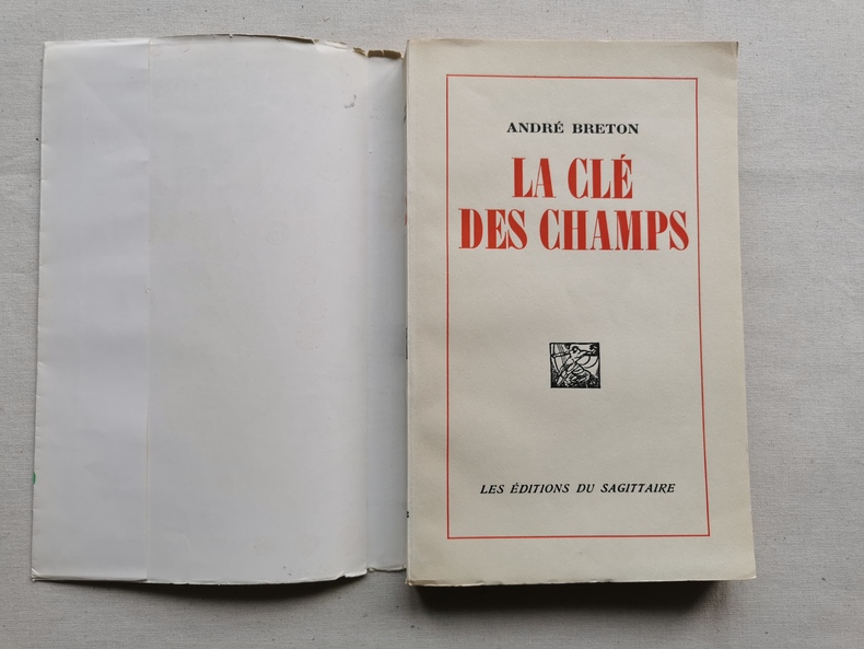 BRETON (André).La Clé des Champs.Paris, Editions du Sagittaire, 1953. In-8°, (23,5 x 14,5 cm), broché, jaquette illustrée par Miro, 286 pp., non coupé. Edition originale. Planches hors-texte, (documents, fac-similé, photographies).Très bel exemplaires & un des 10 hors-commerce, numérotés sur Alfa.