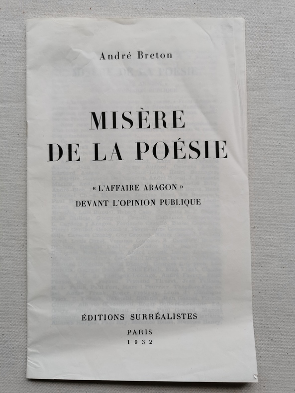 Édition originale À la suite de la publication de son poème "Front rouge" dans l'édition française de la revue "Littérature de la Révolution mondiale" (Moscou, n° 1,1er juillet 1931), puis dans le recueil "Persécuté persécuteur", Aragon est inculpé en novembre d'incitation de militaires à la désobéissance et de provocation au meurtre. André Breton rédige un tract, « L'Affaire Aragon » qui recueille plus de 300 signatures, pour défendre linculpé. L'Humanité désavoue cependant le poème d'Aragon. Breton écrit alors le texte « Misère de la poésie », pour revendiquer l'autonomie de la poésie. Cependant, Aragon ne se reconnaît pas dans le texte de Breton et signifie ainsi sa rupture avec Breton et les surréalistes dans L'Humanité du 10 mars 1932. « Misère de la poésie est un texte qui dépasse de loin les circonstances de sa publication. (...) Elles conduisent Breton à définir avec une grande rigueur la position surréaliste quant aux relations de l'expression lyrique avec la société. L'analyse théorique de Misère de la poésie apparaît ainsi comme une préface aux Vases communicants (1932) et aussi à Position politique du Surréalisme (1935). Il s'agit là certainement du texte de Breton le plus méconnu. » (notice des Tracts de José Pierre, p. 459 sqs) [Gilles Mioni, 2012] cf Gilles Mioni, site André Breton, 2011