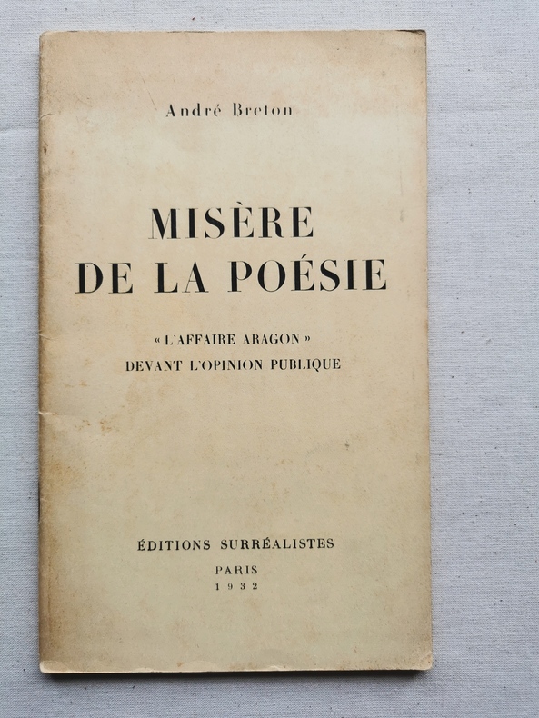 Édition originale À la suite de la publication de son poème "Front rouge" dans l'édition française de la revue "Littérature de la Révolution mondiale" (Moscou, n° 1,1er juillet 1931), puis dans le recueil "Persécuté persécuteur", Aragon est inculpé en novembre d'incitation de militaires à la désobéissance et de provocation au meurtre. André Breton rédige un tract, « L'Affaire Aragon » qui recueille plus de 300 signatures, pour défendre linculpé. L'Humanité désavoue cependant le poème d'Aragon. Breton écrit alors le texte « Misère de la poésie », pour revendiquer l'autonomie de la poésie. Cependant, Aragon ne se reconnaît pas dans le texte de Breton et signifie ainsi sa rupture avec Breton et les surréalistes dans L'Humanité du 10 mars 1932. « Misère de la poésie est un texte qui dépasse de loin les circonstances de sa publication. (...) Elles conduisent Breton à définir avec une grande rigueur la position surréaliste quant aux relations de l'expression lyrique avec la société. L'analyse théorique de Misère de la poésie apparaît ainsi comme une préface aux Vases communicants (1932) et aussi à Position politique du Surréalisme (1935). Il s'agit là certainement du texte de Breton le plus méconnu. » (notice des Tracts de José Pierre, p. 459 sqs) [Gilles Mioni, 2012] cf Gilles Mioni, site André Breton, 2011