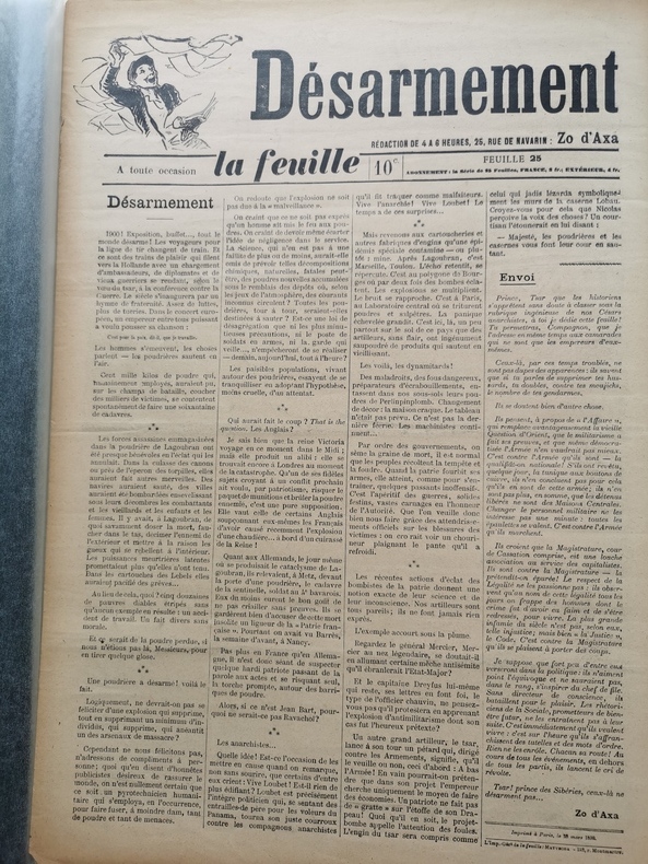25 numéros in-folio(460x330mm.), en feuilles dans un emboîtage de toile noire . "COLLECTION COMPLETE de cette rare revue anarchiste,fondée par Alphonse GALLAUD , dit Charles d'Aulga , dit ZO d'AXA , comportant en premier tirage les vingt-cinq compositions lithographiques dont dix-sept de Steinlen (les numéros 1 et 2 coloriés au pochoir), trois d'Hermann-Paul, une d'Anquetin, une de Maximilien Luce, une de Willette, une de Léandre et une de Couturier. Tous les numéros se présentent sous la forme d'un feuillet occupé au recto par l'illustration et au verso par les textes à l'exception des numéros 11 et 12 qui comptent deux feuillets imprimés d'un seul côté; dans ce dernier numéro, la lithographie de Steinlen est en deux parties à mi-page. Dix des vingt-cinq lithographies portent le nom de Bertin et Cie. Complet de l'affiche illustrée de librairie : 'Société Libre d'édition des gens de lettres' (305X440mm) Exemplaire dans un grand état de fraîcheur."