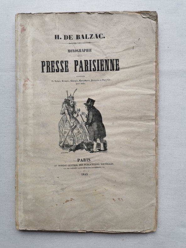 "Paris: Bureau central des publications nouvelles, 1842. Grand in-8(280x182mm.) broché, couverture illustrée. "EDITION ORIGINALE, constituée par le tirage à part, avec pagination nouvelle, titre et couverture illustrée, des pages imprimées dans 'La grande ville, nouveau tableau de Paris' (2 volumes). Un tableau hors-texte; trois hors-texte et trente vignettes gravées sur bois de bout, dont une représentant Balzac discutant avec la Presse, reprise sur la couverture. En adressant cette image à Mme Hanska, Balzac écrivait:...'ça ne me ressemble guère, mais c'est assez la ressemblance de la redingote avec laquelle je trotte le matin à mes imprimeries et, surtout celle du chapeau qui reçoit les averses...'. Bel exemplaire dans son 'jus' d'époque."