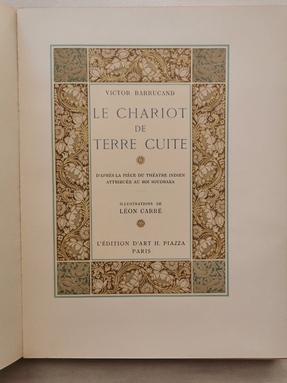 Tirée à 910 exemplaires numérotés, celui-ci sur vélin des Manufactures Blanchet frères et Kleber.Illustré de 20 hors-texte en couleurs de Léon Carré protégés par des serpentes légendées et d'ornements exécutés d'après des peintures décoratives d'art bouddhique retrouvées dans les temples de l'Inde ancienne.Cette pièce mise en scène en 1895 par Lugné-Poe avec des décors et une affiche de Toulouse-Lautrec, est ici illustré par Léon Carré, ami intime de Barrucand à Alger.