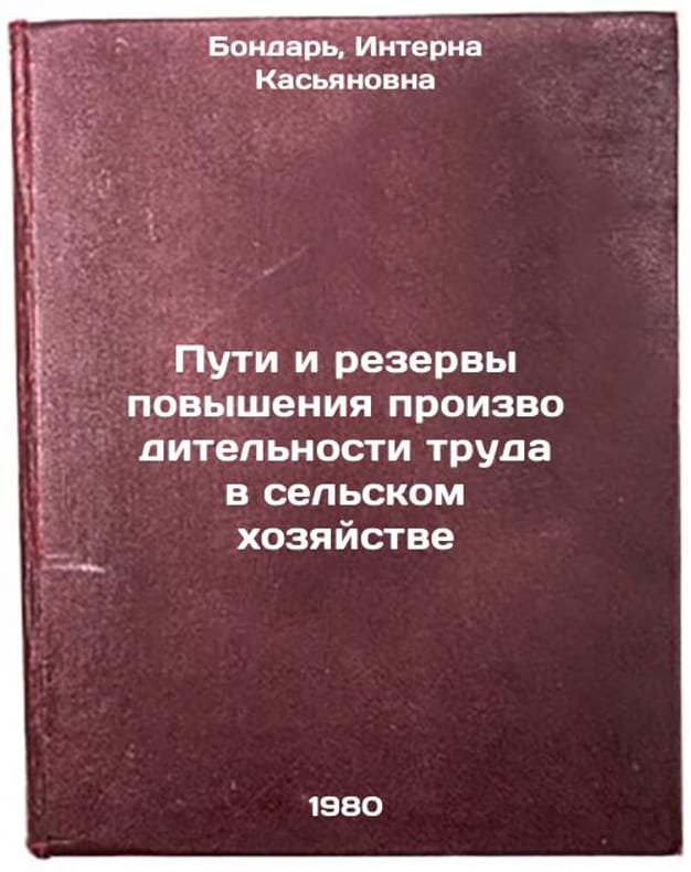 In Russian. Bondar, Interna Kasyanovna. Ways and Reserves to Increase Labor Productivity in Agriculture. Kyiv: The Knowledge of the Ukrainian SSR,. Puti i rezervy povysheniya proizvoditel'nosti truda v sel'skom khozyaystve. In Russian /Ways and Reserves to Increase Agricultural Productivity . All images are for identification of editions only. Several books of the same edition may be available. Please feel free to request photos of available books. SKU1002155
