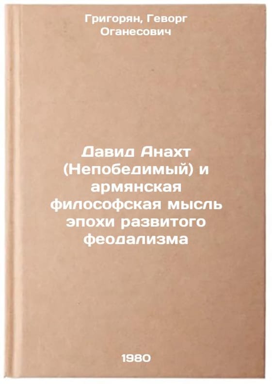 In Russian. Grigoryan, Gevorg Oganesovich. David Anakht (Invincible) and the Armenian philosophical thought of the era of advanced feudalism. Yerevan: Editions of the Academy of Sciences of the Armenian SSR,. David Anakht (Nepobedimyy) i armyanskaya filosofskaya mysl' epokhi razvitogo feodalizma. In Russian /David Anakht (Invincible) and the Armenian Philosophical Thought of the Age of Developed Feudalism . All images are for identification of editions only. Several books of the same edition may be available. Please feel free to request photos of available books. SKU1002903