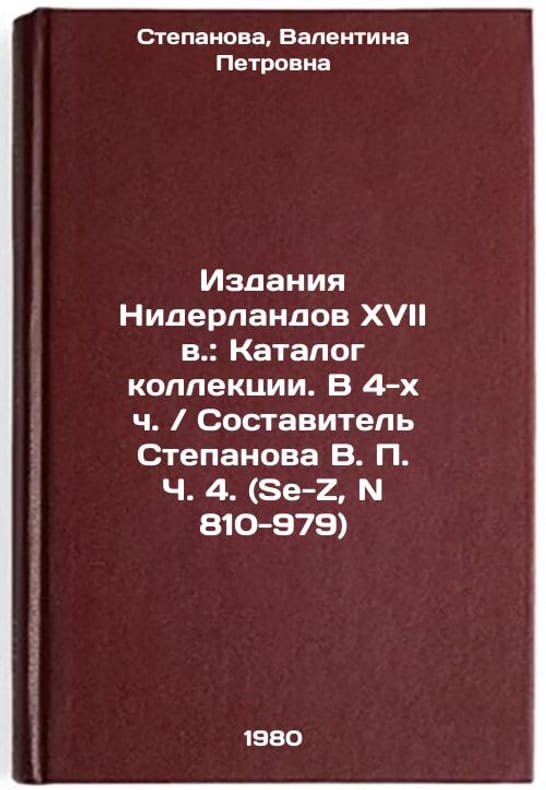 In Russian. Stepanova, Valentina Petrovna. Publications of the Netherlands of the seventeenth century: Catalogue of the collection. [In 4 h. / Compiled by Stepanova V. P.] Part 4. (Se-Z, N 810-979). Izdaniya Niderlandov XVII v.: Katalog kollektsii. V 4-kh ch. Sostavitel' Stepanova V. P. Ch. 4. (Se-Z, N 810-979). In Russian /Publications of the Netherlands of the seventeenth century: Catalogue of the collection. In 4 h. Compiled by Stepanova V. P. Part 4. (Se-Z, N 810-979) . All images are for identification of editions only. Several books of the same edition may be available. Please feel free to request photos of available books. SKU1003163