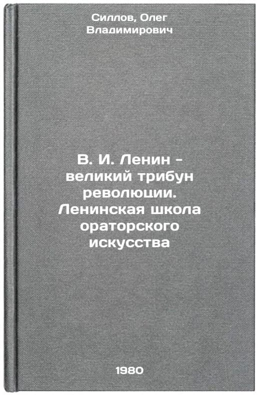 In Russian. Sillov, Oleg Vladimirovich. V. I. Lenin - the great tribunes of the revolution. Lenin's school of oratorical art. V. I. Lenin - velikiy tribun revolyutsii. Leninskaya shkola oratorskogo iskusstva. In Russian /V. I. Lenin - the great tribunes of the revolution. Lenin's school of oratorical art . All images are for identification of editions only. Several books of the same edition may be available. Please feel free to request photos of available books. SKU1008471