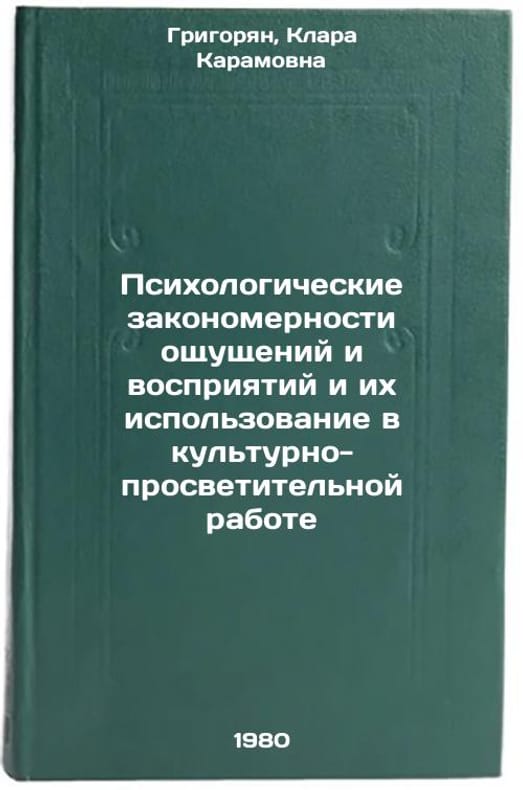 In Russian. Grigoryan, Klara Karamovna. Psychological regularities of sensations and perceptions and their use in cultural and educational work. Moscow: IPCC,. Psikhologicheskie zakonomernosti oshchushcheniy i vospriyatiy i ikh ispol'zovanie v kul'turno- prosvetitel'noy rabote. In Russian /Psychological regularities of sensations and perceptions and their use in cultural and educational work . All images are for identification of editions only. Several books of the same edition may be available. Please feel free to request photos of available books. SKU1013758