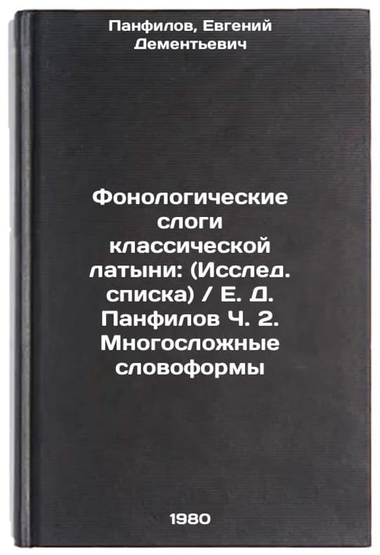 In Russian. Panfilov, Evgeniy Dementievich. Phonological syllables of classical Latin: (Research List) / E. D. Panfilov Part 2. Multiple Word Forms. Fonologicheskie slogi klassicheskoy latyni: (Issled. spiska). E. D. Panfilov Ch. 2. Mnogoslozhnye slovoformy. In Russian /Phonological syllables of classical Latin: (List Explorer). E. D. Panfilov Part 2. Multiple Word Forms . All images are for identification of editions only. Several books of the same edition may be available. Please feel free to request photos of available books. SKU1016953