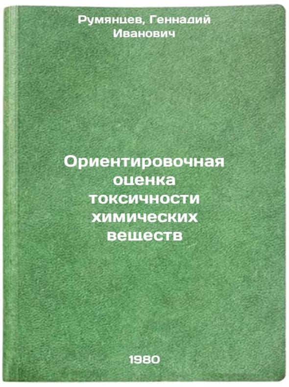 In Russian. Rumyantsev, Gennady Ivanovich. Indicative Assessment of Chemical Toxicity. Moscow: I MMI, 1979 (vol. 1980). Orientirovochnaya otsenka toksichnosti khimicheskikh veshchestv. In Russian /Indicative toxicity assessment of chemicals . All images are for identification of editions only. Several books of the same edition may be available. Please feel free to request photos of available books. SKU7636894