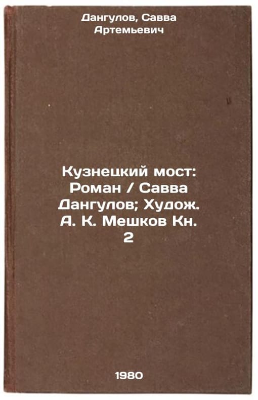 "In Russian. Dangulov, Savva Artemyevich. Kuznetsk Bridge: Roman / Savva Dangulov; [Artist A. K. Meshkov] Book 2. Kuznetskiy most: Roman. Savva Dangulov; Khudozh. A. K. Meshkov Kn. 2. In Russian /Kuznetsk Bridge: Roman. Savva Dangulov; Artist A. K. Meshkov Book 2 . All images are for identification of editions only. Several books of the same edition may be available. Please feel free to request photos of available books. SKU1019745"