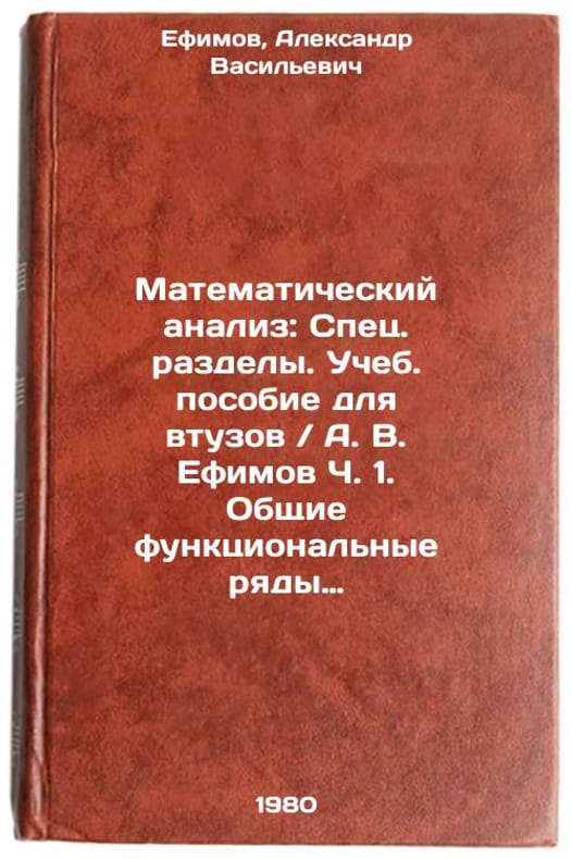 In Russian. Efimov, Alexander Vasilievich. Mathematical Analysis: Special Sections. [Textbook for Vacuums] / A. V. Efimov Ch. 1. General Functional Series and their Appendix. Matematicheskiy analiz: Spets. razdely. Ucheb. posobie dlya vtuzov. A. V. Efimov Ch. 1. Obshchie funktsional'nye ryady i ikh prilozhenie. In Russian /Mathematical Analysis: Special Sections. Tutorial for Inducements. A. V. Efimov Part 1. General Functional Series and their Appendix . All images are for identification of editions only. Several books of the same edition may be available. Please feel free to request photos of available books. SKU1021759