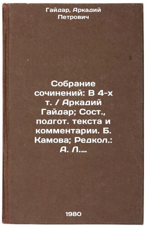 "In Russian. Gaidar, Arkady Petrovich. A collection of essays: In the 4th volume / Arkady Gaidar; [Compiled, prepared text and commentary by B. Kamov; Redkol: A. L. Barto et al.; Ric. A. Verkau] Vol. 2. M.: Det. lit. Sobranie sochineniy: V 4-kh t. Arkadiy Gaydar; Sost. podgot. teksta i komment. B. Kamova; Redkol.: A. L. Barto i dr.; Ris. A. Verkau T. 2. In Russian /A collection of essays: In 4 Vol. Arkady Gaidar; Content, prepared text and commentary by B. Kamov; Redkol.: A. L. Barto et al.; Ric. A. Verkau Vol. 2. . All images are for identification of editions only. Several books of the same edition may be available. Please feel free to request photos of available books. SKU1023027"