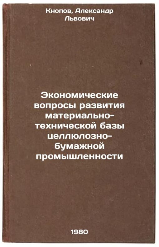 In Russian. Knopov, Alexander Lvovich. Economic Issues of Developing the Material and Technical Base of the Pulp and Paper Industry. Leningrad: Leningrad Forestry Technological Academy,. Ekonomicheskie voprosy razvitiya material'no-tekhnicheskoy bazy tsellyulozno-bumazhnoy promyshlennosti. In Russian /Economic Issues in the Material Development of the Pulp and Paper Industry . All images are for identification of editions only. Several books of the same edition may be available. Please feel free to request photos of available books. SKU1026124