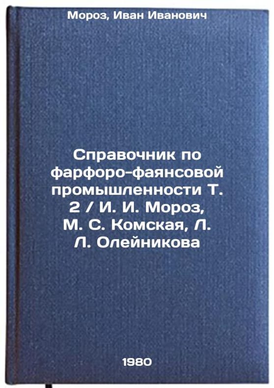 In Russian. Moroz, Ivan Ivanovich. Reference book on porcelain and faience industry T. 2 / I. I. Moroz, M. S. Komskaya, L. L. Oleynikova. M.: Leg. industry. Spravochnik po farforo-fayansovoy promyshlennosti T. 2. I. I. Moroz, M. S. Komskaya, L. L. Oleynikova. In Russian /Reference book on porcelain and faience industry T. 2. I. I. Moroz, M. S. Komskaya, L. L. Oleynikova . All images are for identification of editions only. Several books of the same edition may be available. Please feel free to request photos of available books. SKU1027208